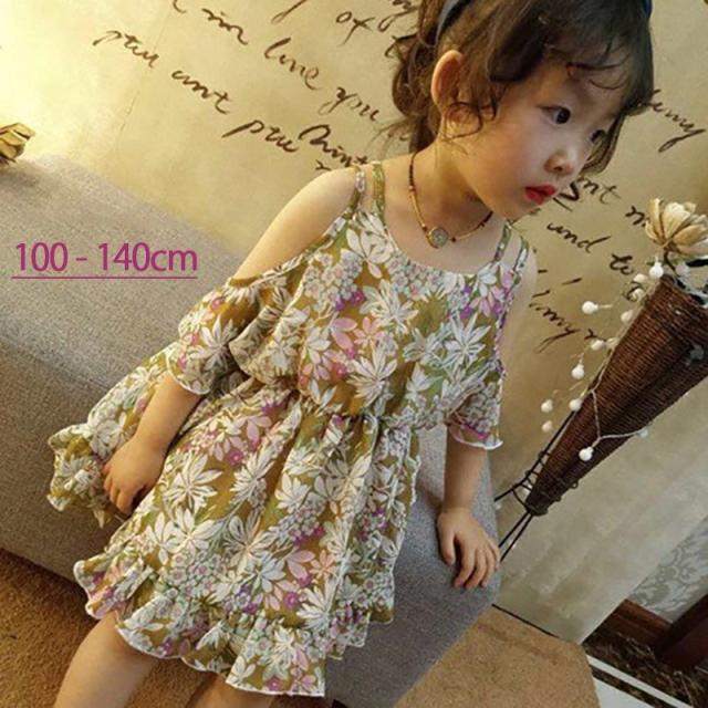 子供服 キッズ服 キッズウェア ワンピース オープンショルダー ノースリーブ風 フリル 花柄 カラフル 女の子 夏服 シンプル かわいい おしゃれ 1