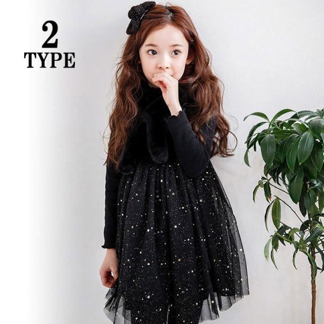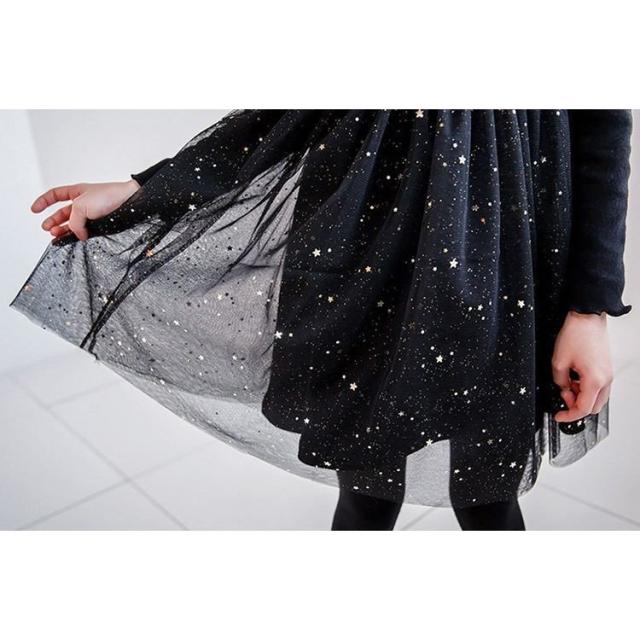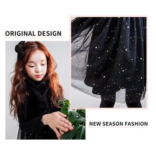 ワンピース 子供用 女の子 長袖 ミニ丈 ショート丈 ハイネック ハイウエスト 裏起毛 ラメチュール 星 スター チュール かわいい おしゃれ お嬢様