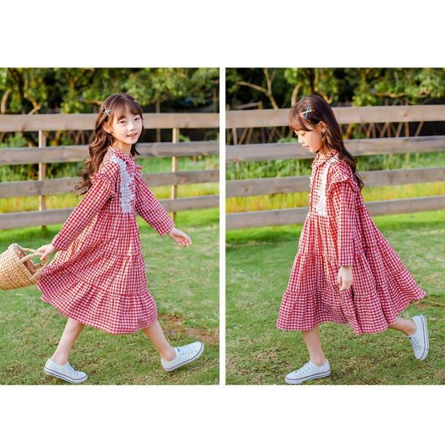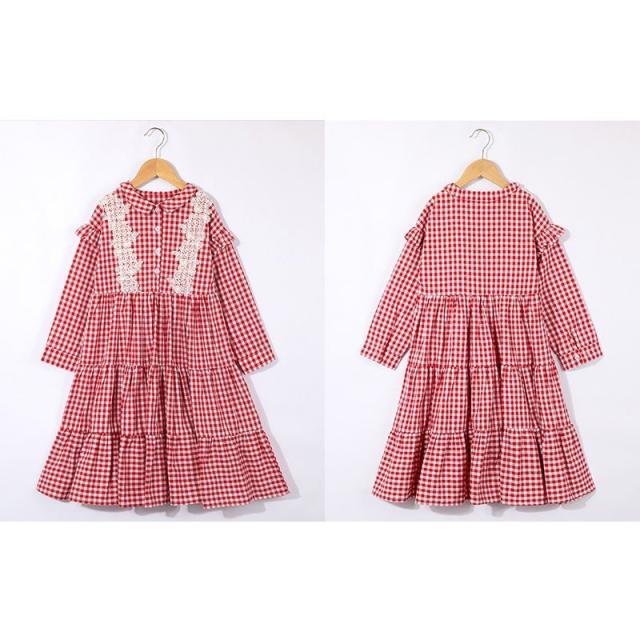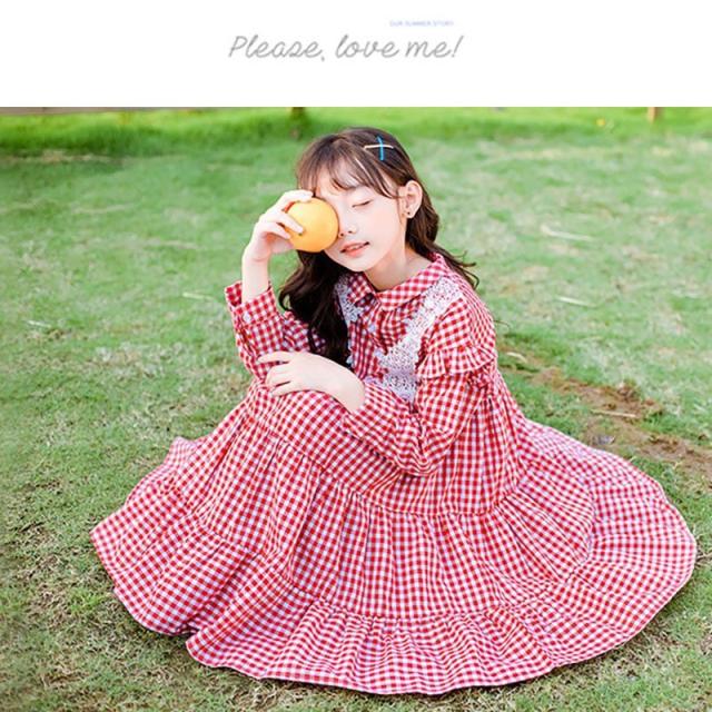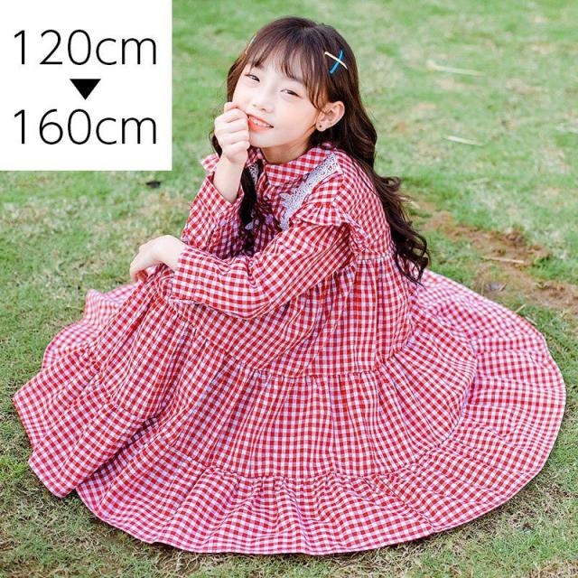 ワンピース 長袖 ギンガムチェック 肩フリル ギャザースカート ティアードスカート 襟付き レース 可愛い 女の子 女児 キッズ ジュニア