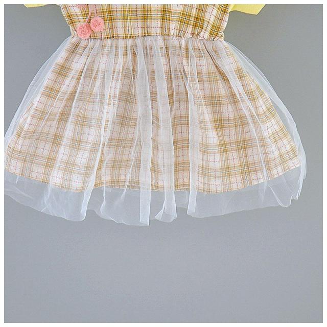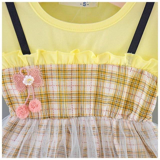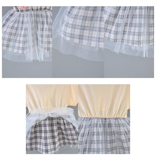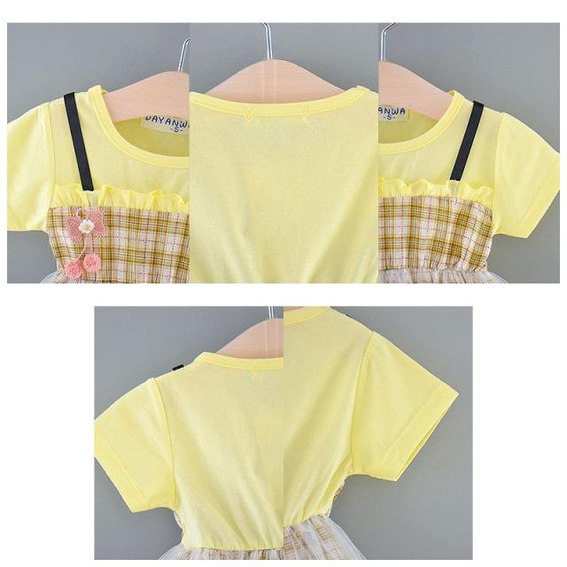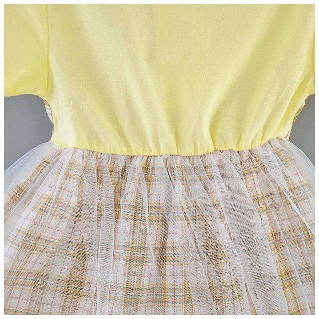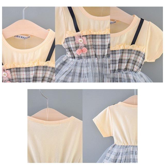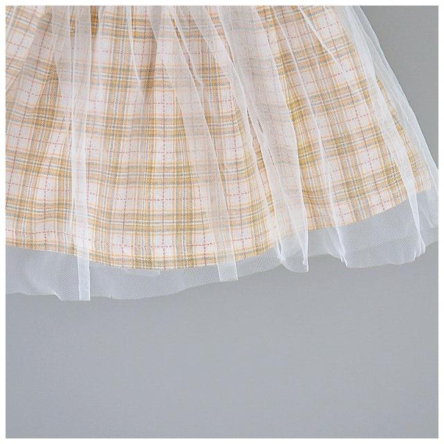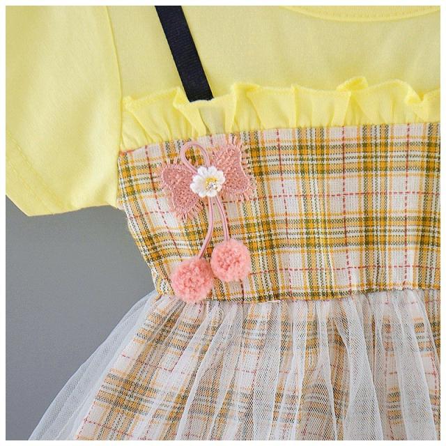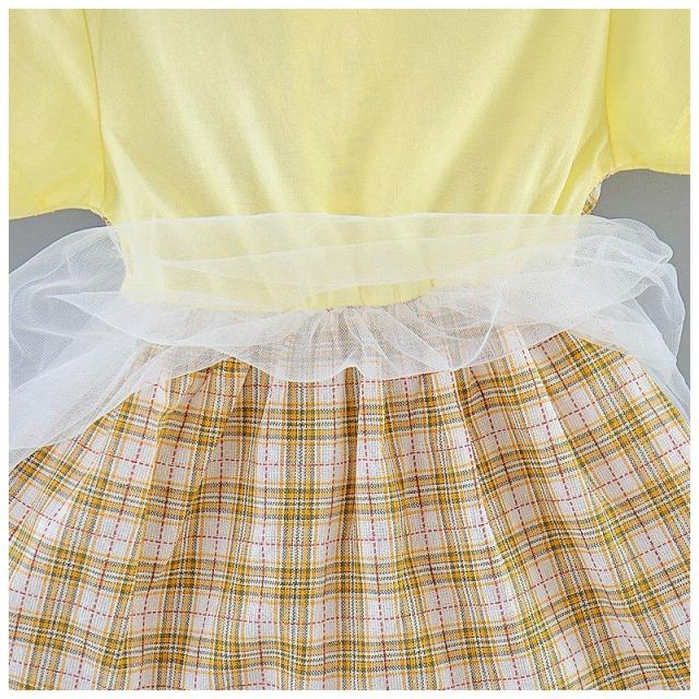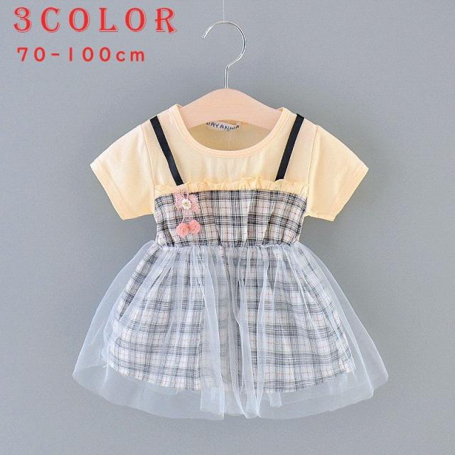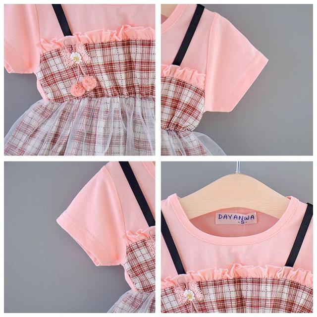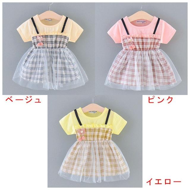 ベビー服 ベビーウェア ワンピース 半袖 ツーピース風 Tシャツ ストラップスカート メッシュスカート チェック柄 ワンポイント刺繍 シンプル かわい
