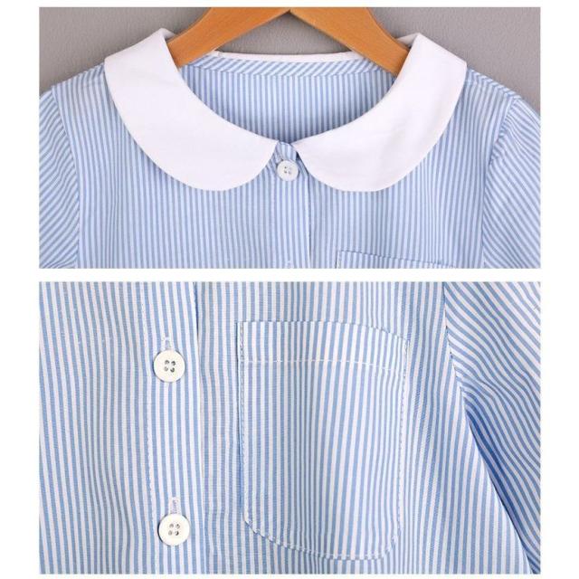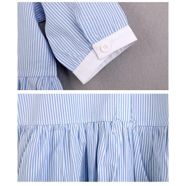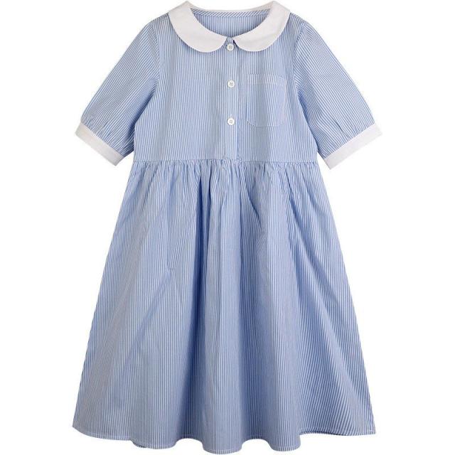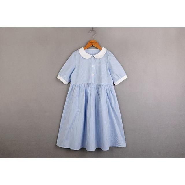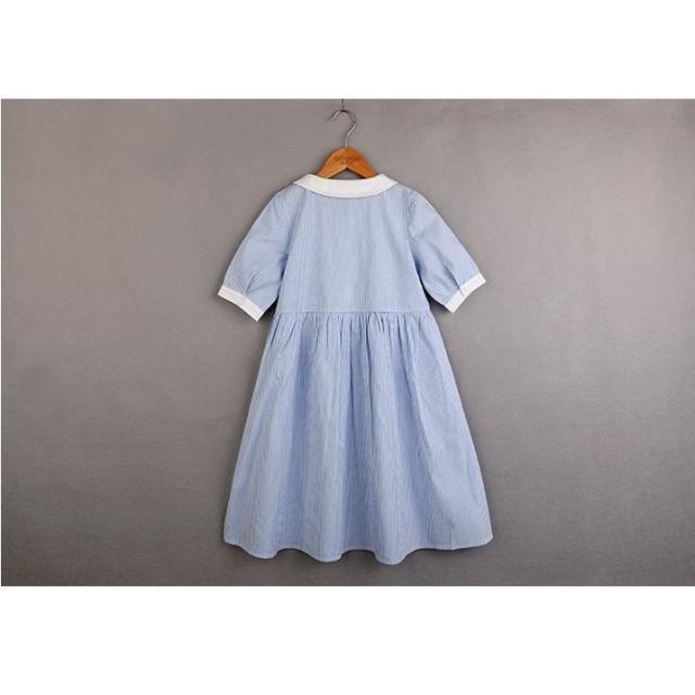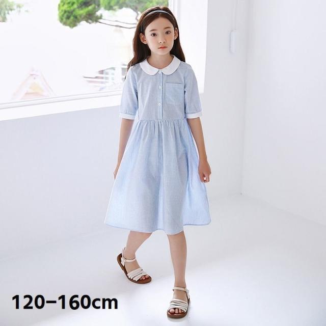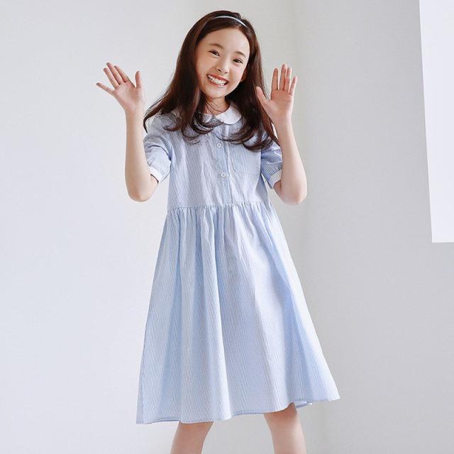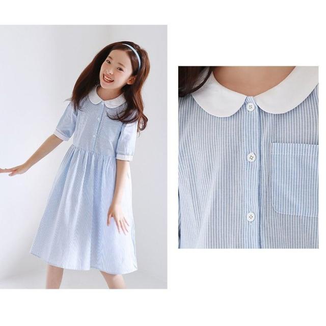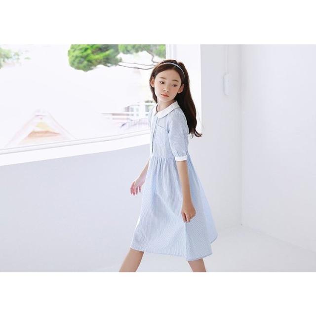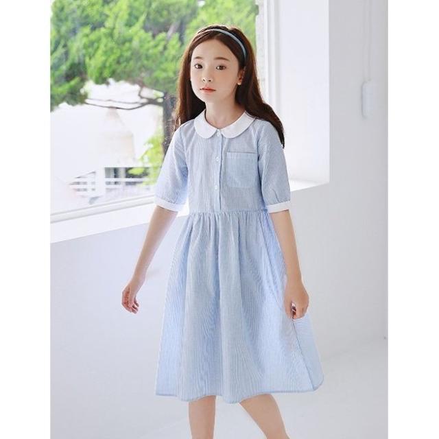 ワンピース 半袖 五分袖 キッズ ジュニア 子供 女子 女の子 Aライン 膝丈 ミディアム 丸襟 ピーターパンカラー ギャザー ポケット付き 前ボタン
