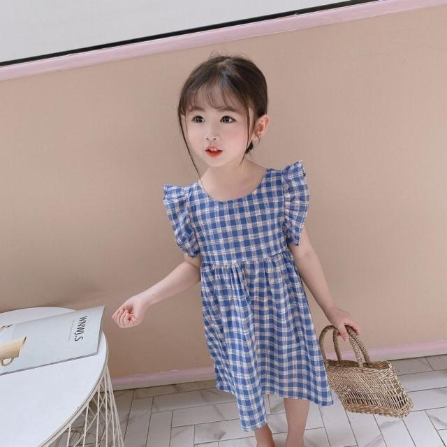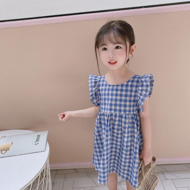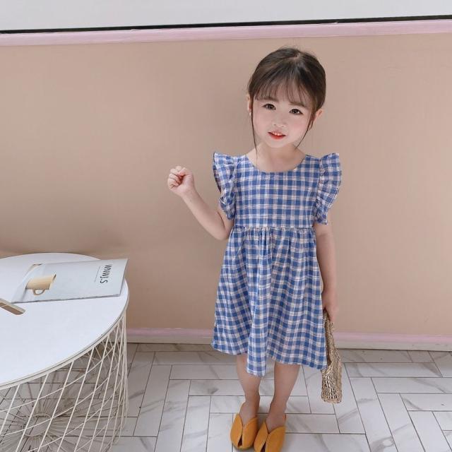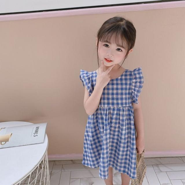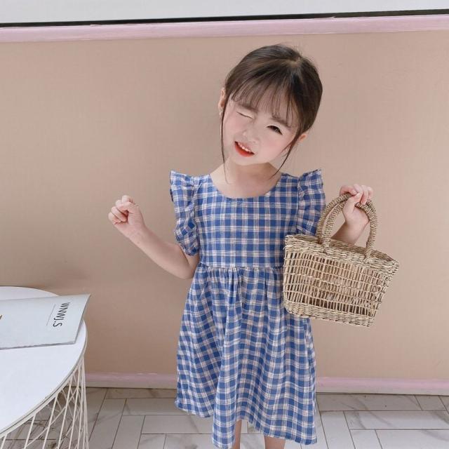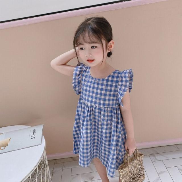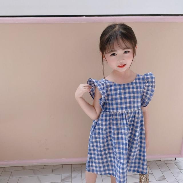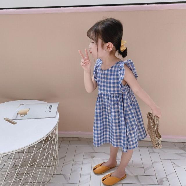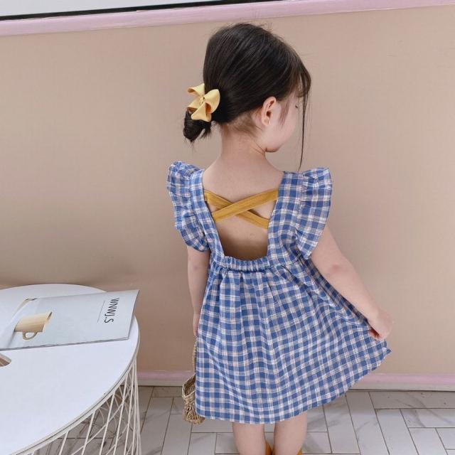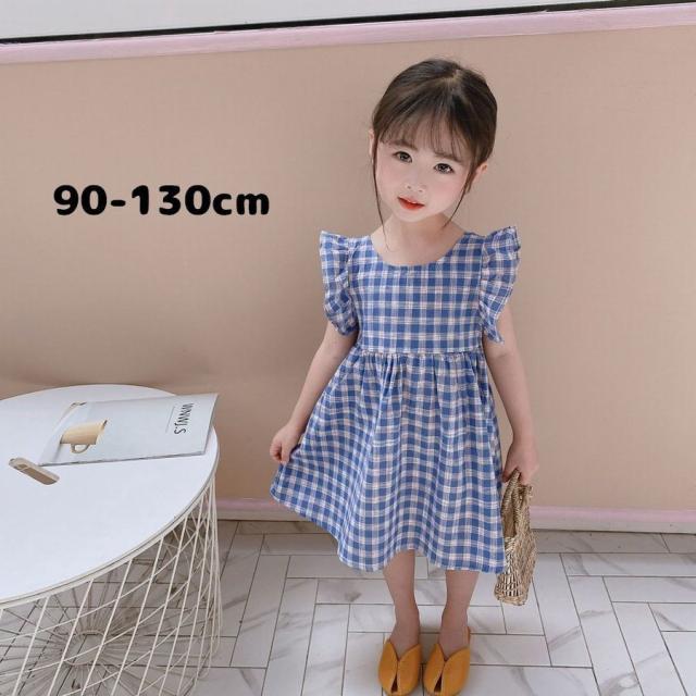 ワンピース キッズ ベビー 子供服 子供用 女の子 ラウンドネック ノースリーブ 背中開き チェック柄 フリル ギャザー フレア 切り替え 背中見せ
