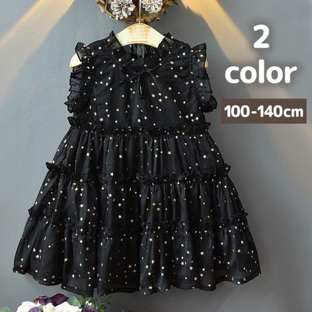 ワンピース ノースリーブ トップス キッズ 女の子 丸襟 Aライン 切り替え ティアード 襟フリル 袖フリル リボン 膝丈 総柄 スター 星 ドット