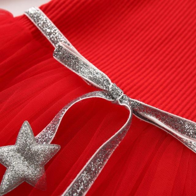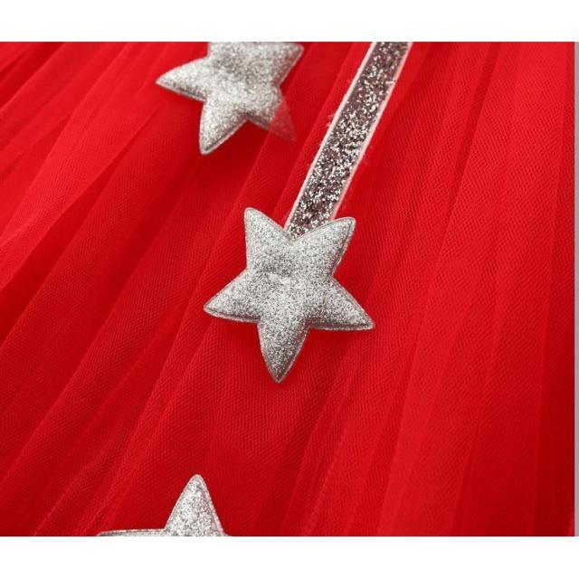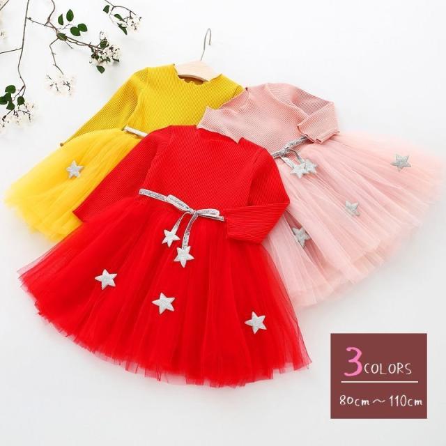 ワンピース ドレス ベビー キッズ 子供服 長袖 ラウンドネック フレア ミディアム チュール 星 リボン 可愛い オシャレ キュート おめかし ふん