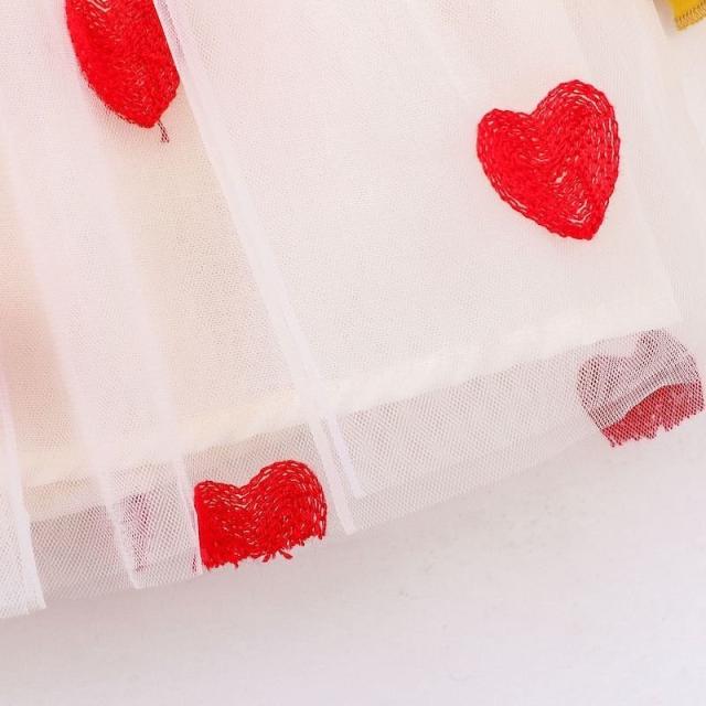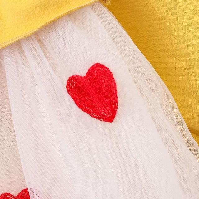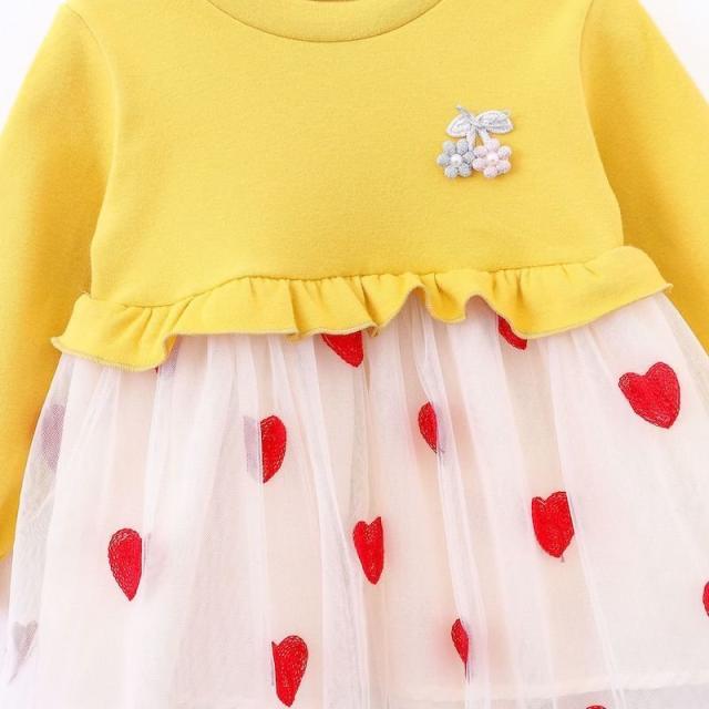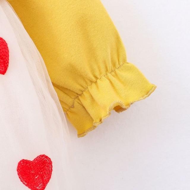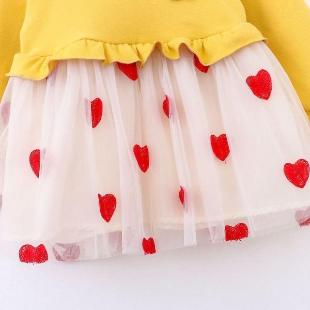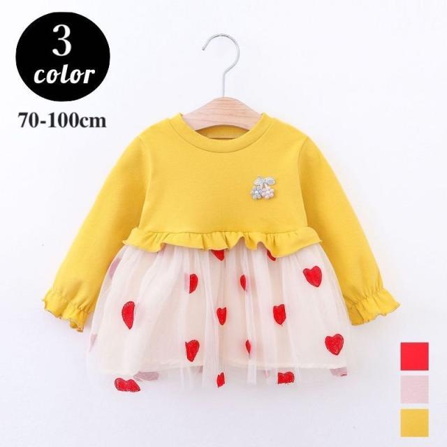 ワンピース 長袖 ベビー 子供服 キッズ 女の子 春 秋 ラウンドネック 花 ハート柄 チュール メッシュ Aライン かわいい お出かけ 結婚式 発表