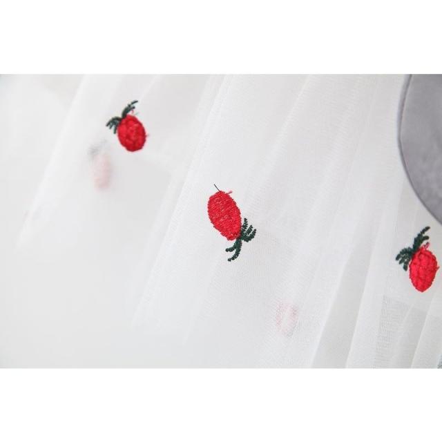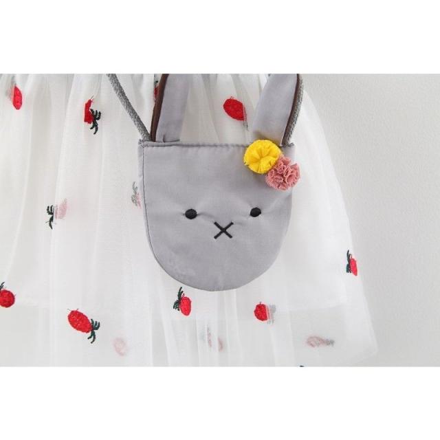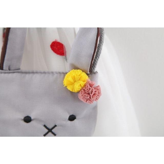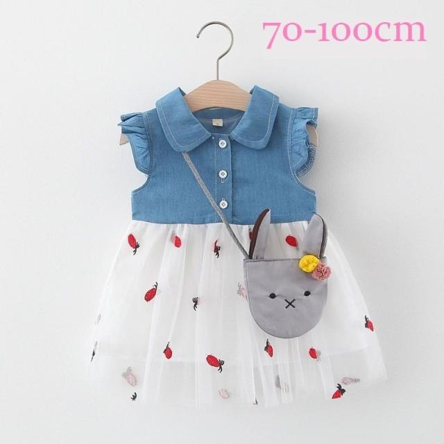 ワンピース ベビー キッズ 女の子 チュール デニム風 切替 フレア ノースリーブ フリル 前ボタン 丸襟付き 異素材 パイナップル 刺繍 うさぎ ウ