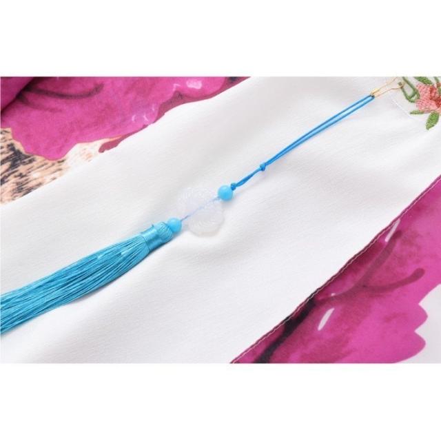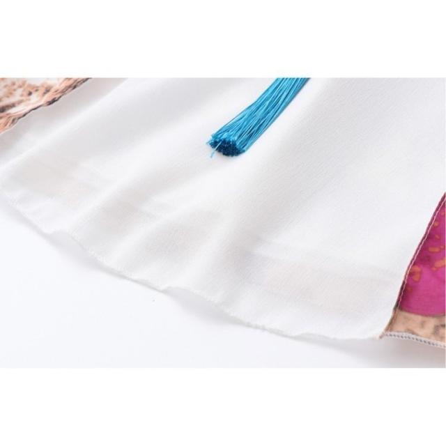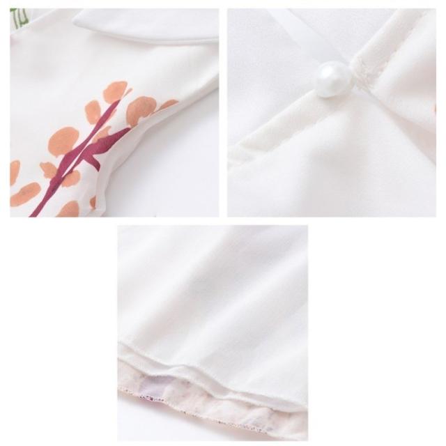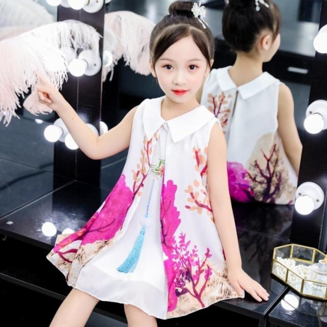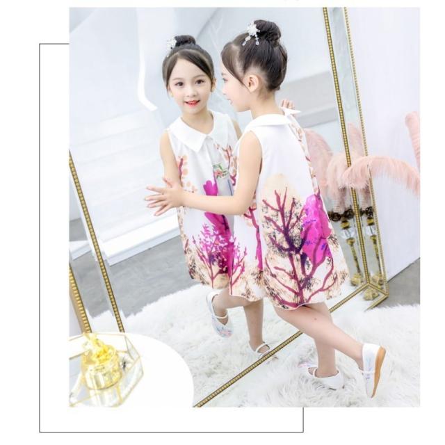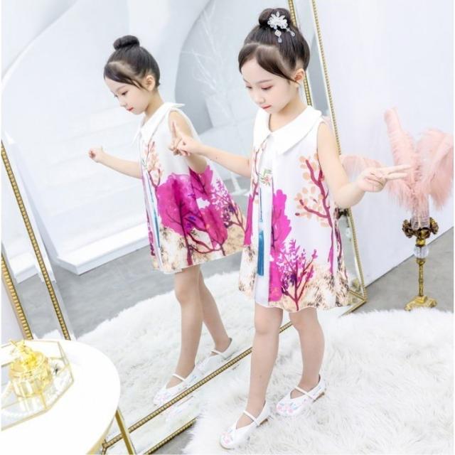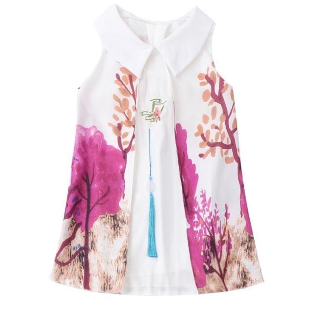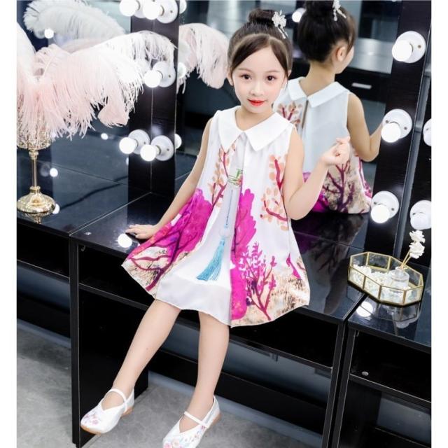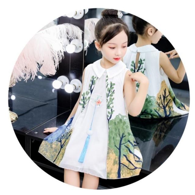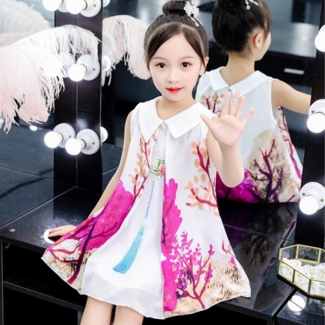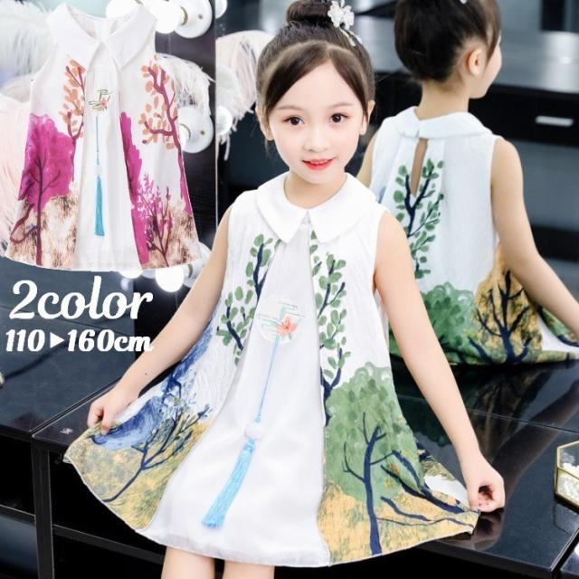 ワンピース ノースリーブ ミニ丈 ショート丈 Aライン 子供服 キッズ ジュニア 水墨画風 タッセル タック バックボタン ピューリタンカラー おしゃ