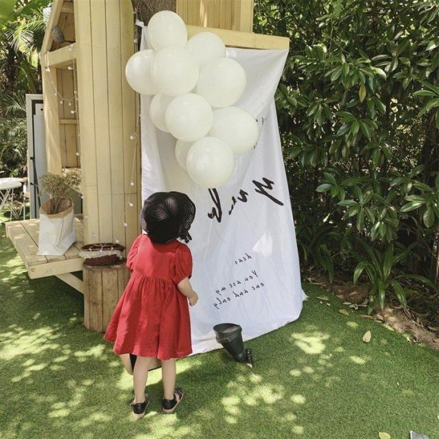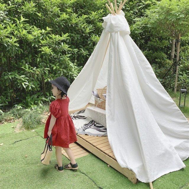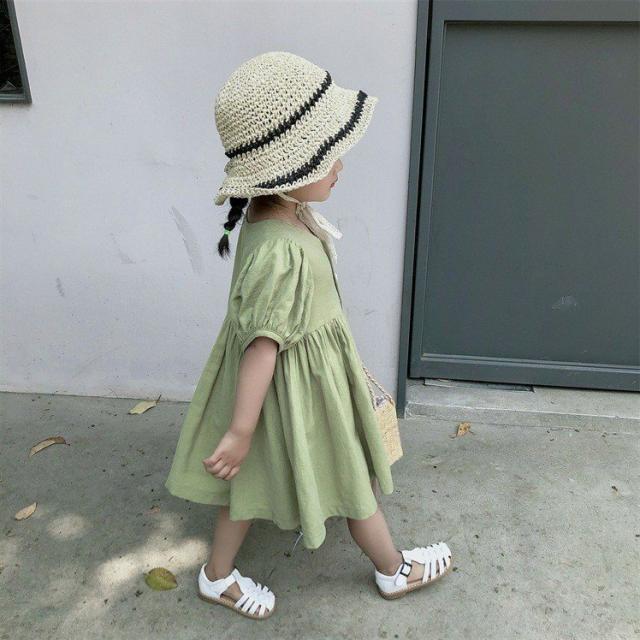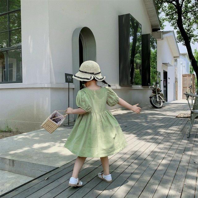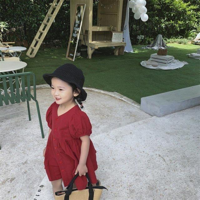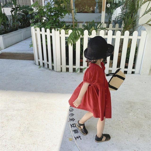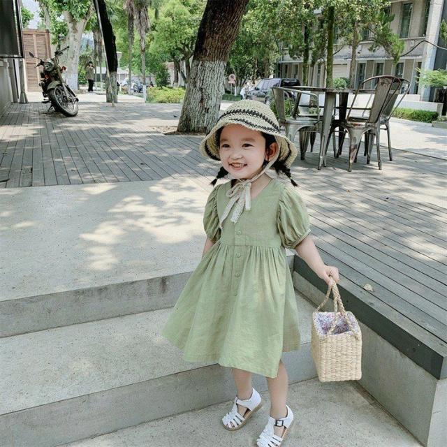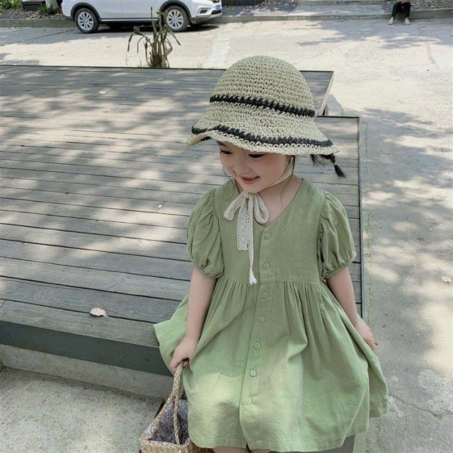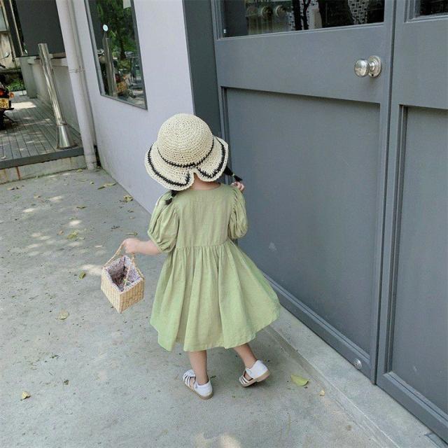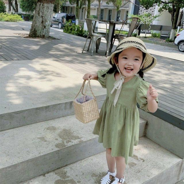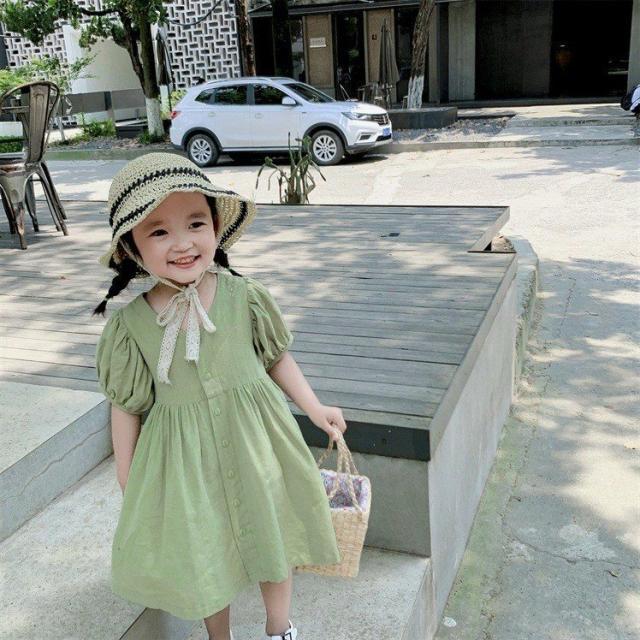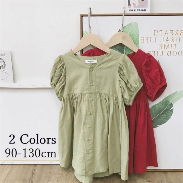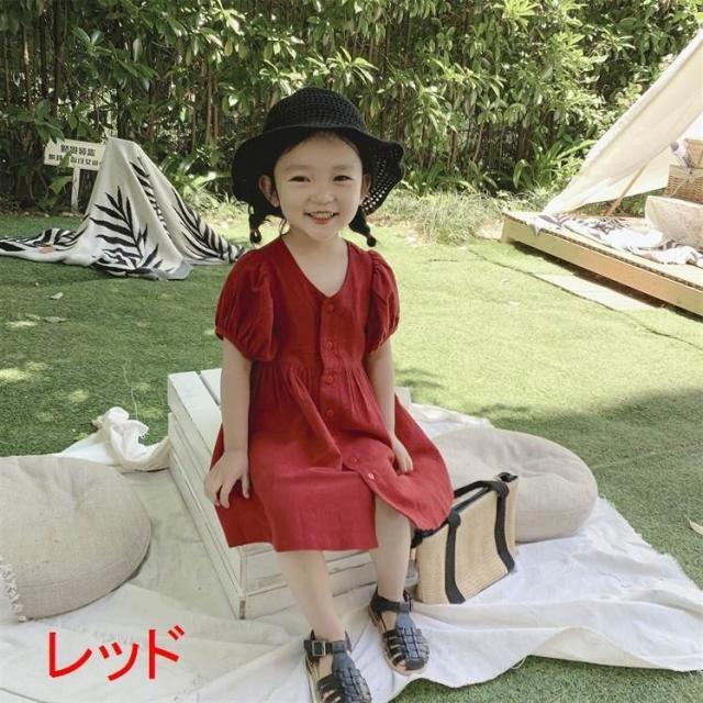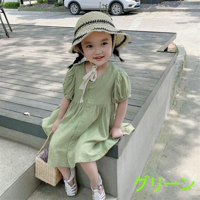 ワンピース シャツワンピ ベビー キッズ 女の子 子供服 半袖 クルーネック パフスリーブ 膝丈 膝上 フレア ボタン シンプル かわいい 無地