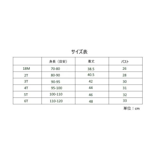 | サイズ | 18M 2T 3T 4T 5T 6T |