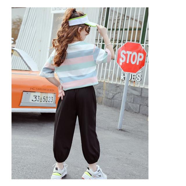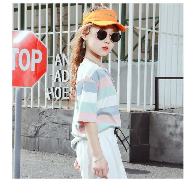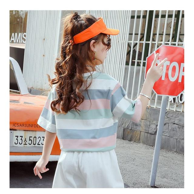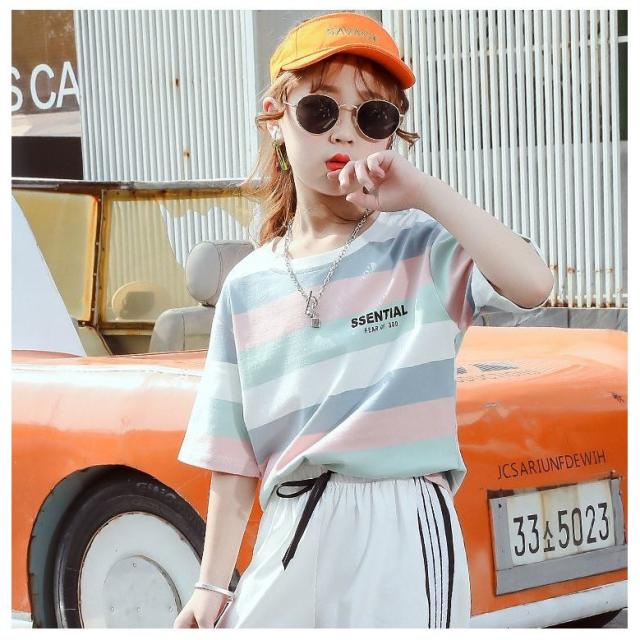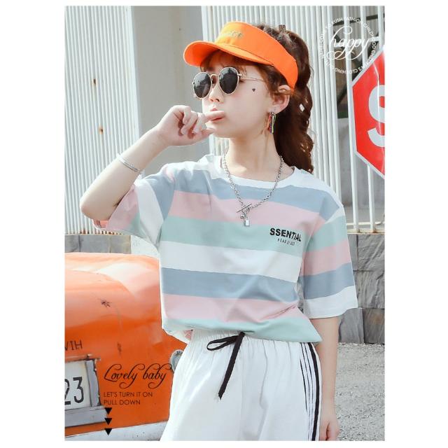 Tシャツ 半袖 キッズ 子ども ジュニア 女の子 ラウンドネック ボーダー ロゴ カジュアル 夏服 ゆったり 長め パステルカラー おしゃれ かわいい