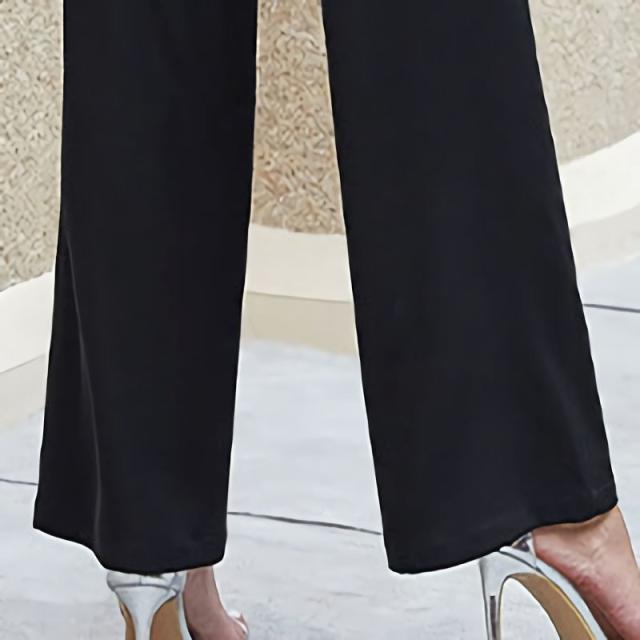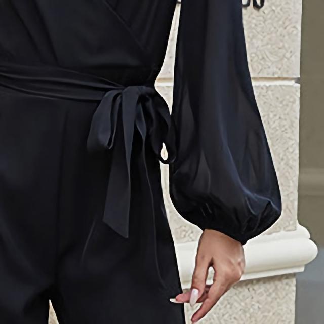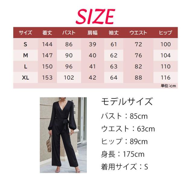 オールインワン ジャンプスーツ レディース 長袖 長ズボン ロングパンツ Vネック カシュクール ウエストリボン セクシー つなぎ 無地 シンプル 大