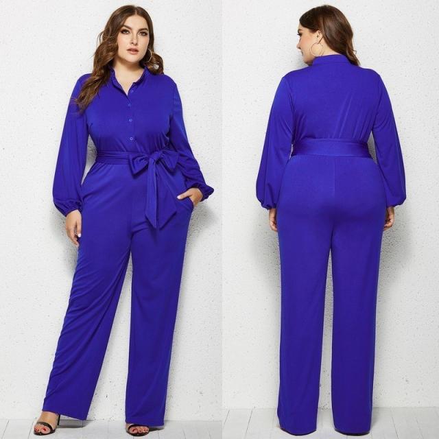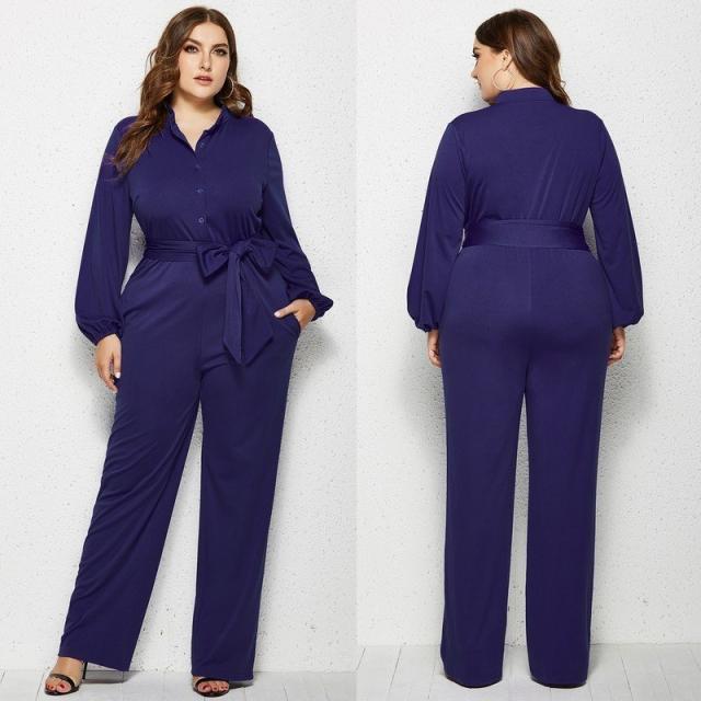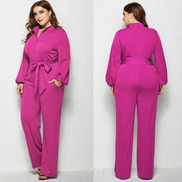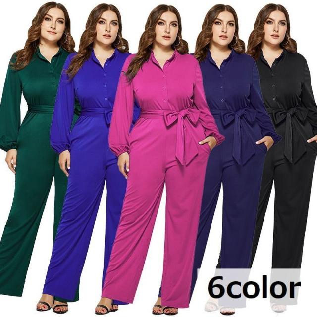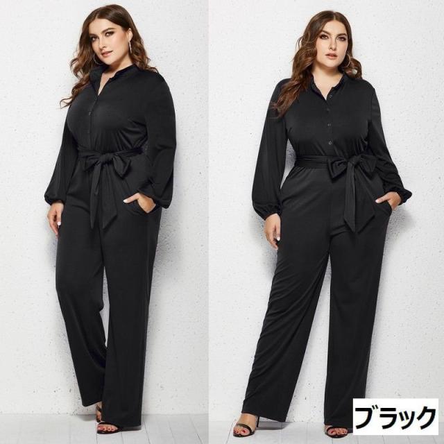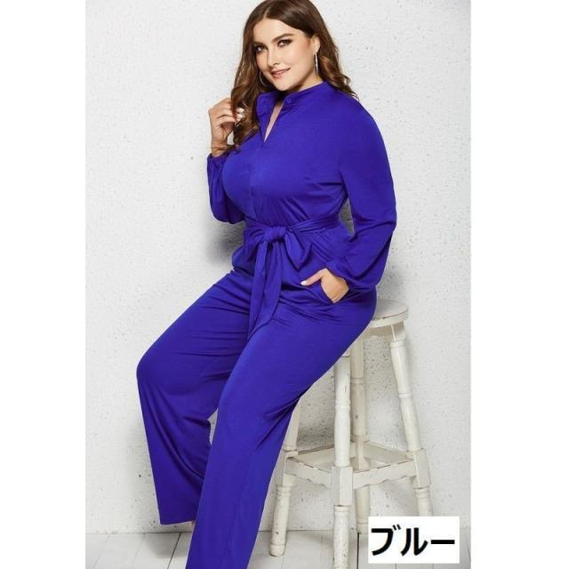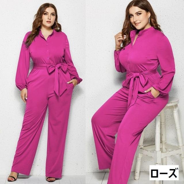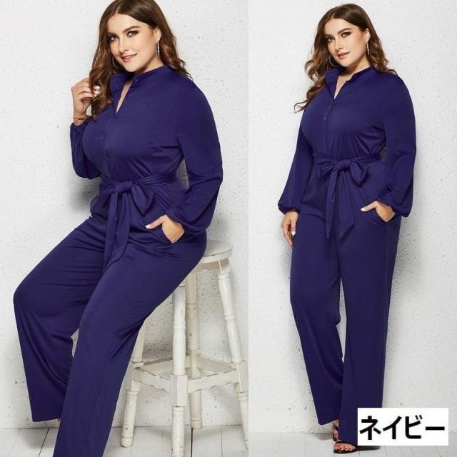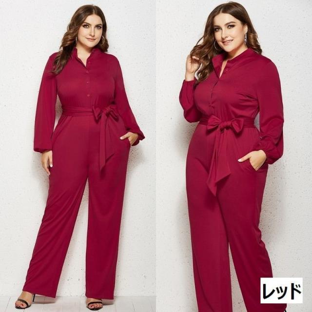 オールインワン ジャンプスーツ レディース 婦人服 長袖 スタンドカラー 前開き ウェストリボン シンプル 無地 おしゃれ 2XL 3XL 4XL 5