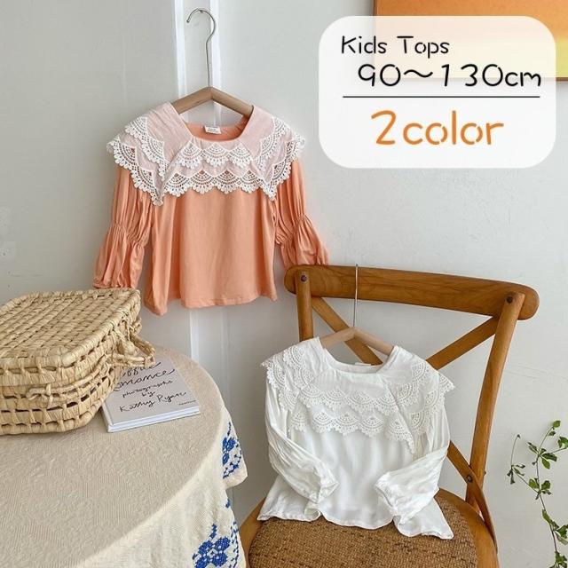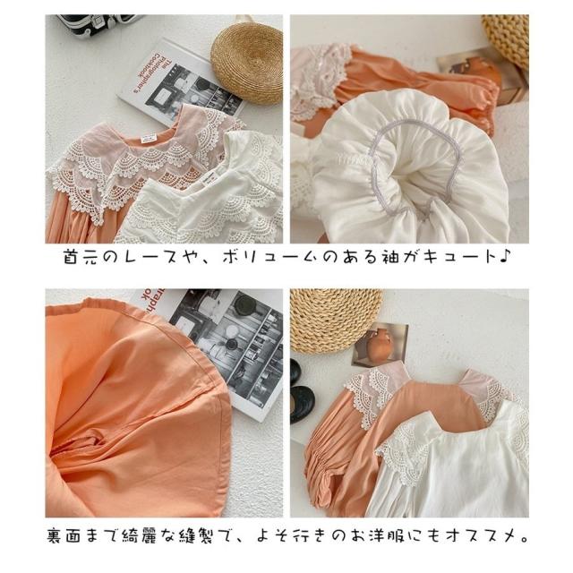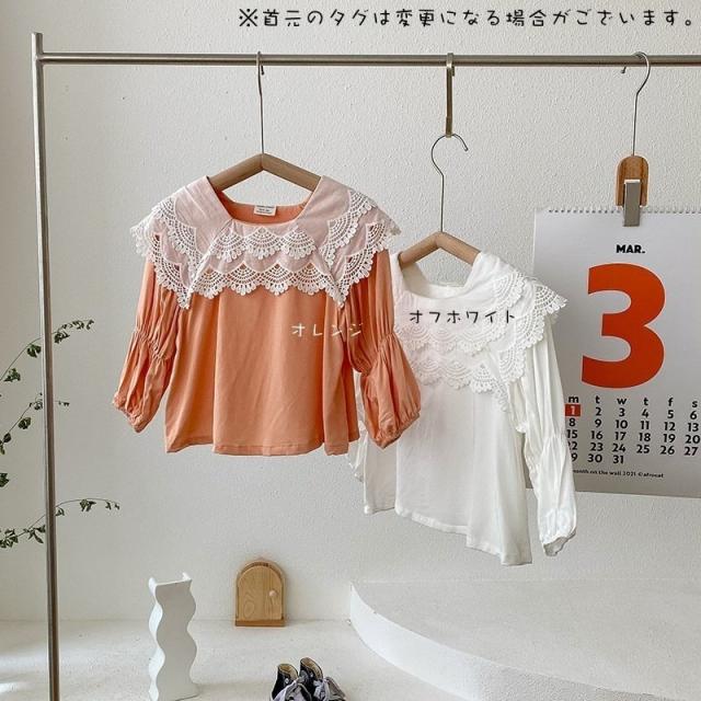 ブラウス キッズ 子供服 子ども服 女の子 トップス 長袖 パフスリーブ スクエアネック 袖ゴム 襟レース プルオーバー 無地 オレンジ オフホワイト