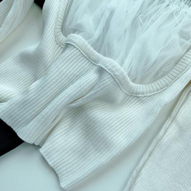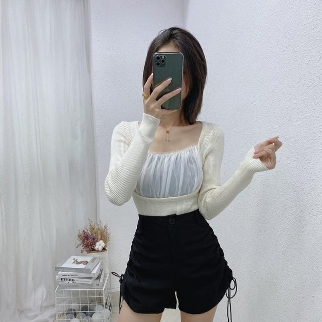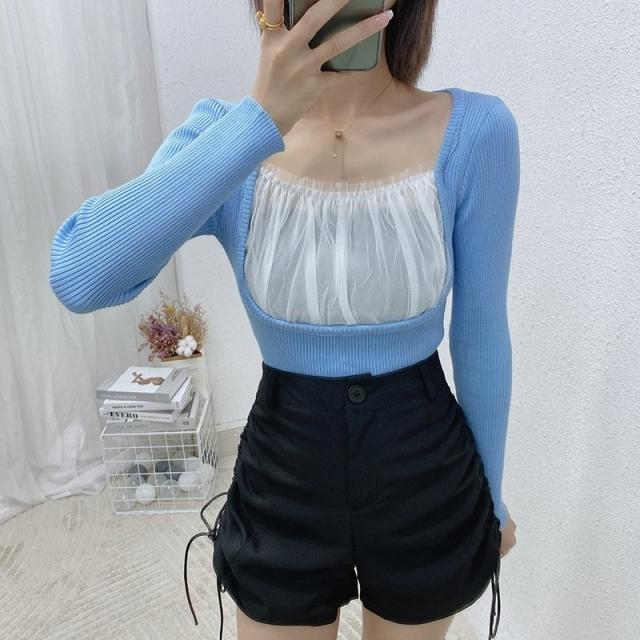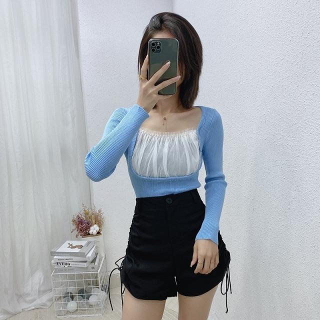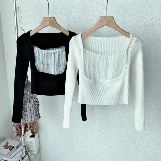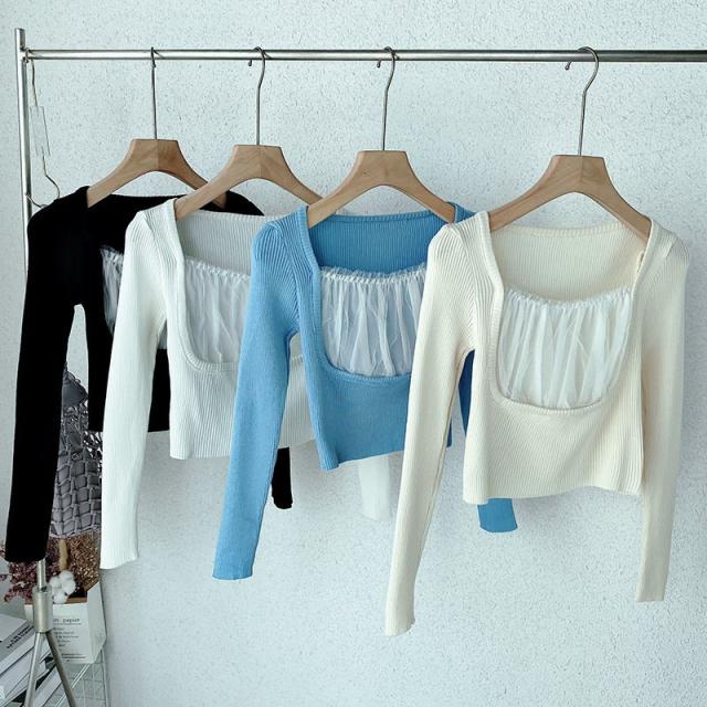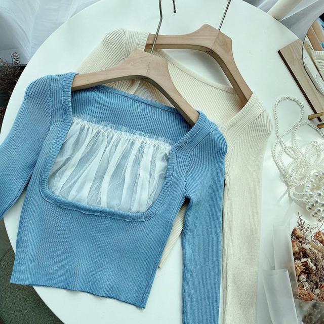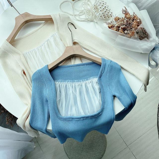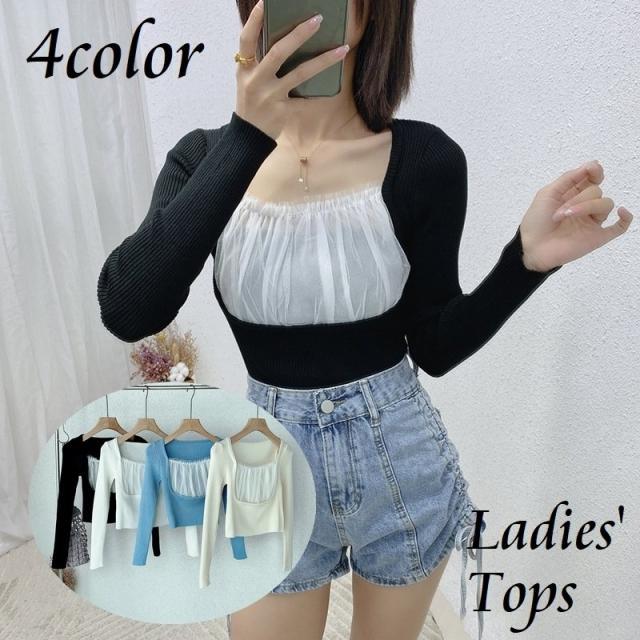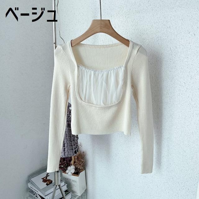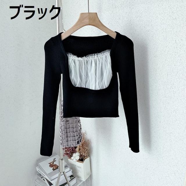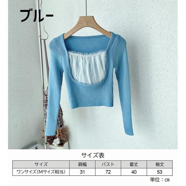 ニット 長袖 レディース トップス 女性 セーター プルオーバー スクエアネック シースルー レース フリル シースルー 透け感 可愛い おしゃれ
