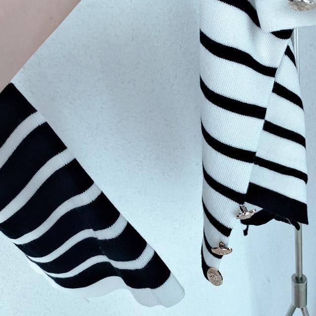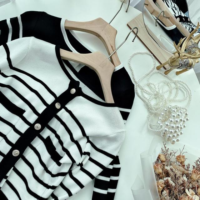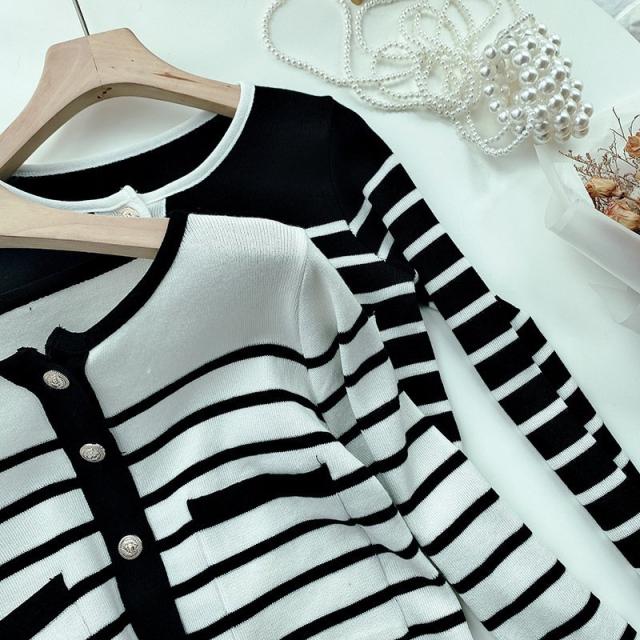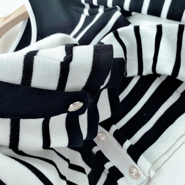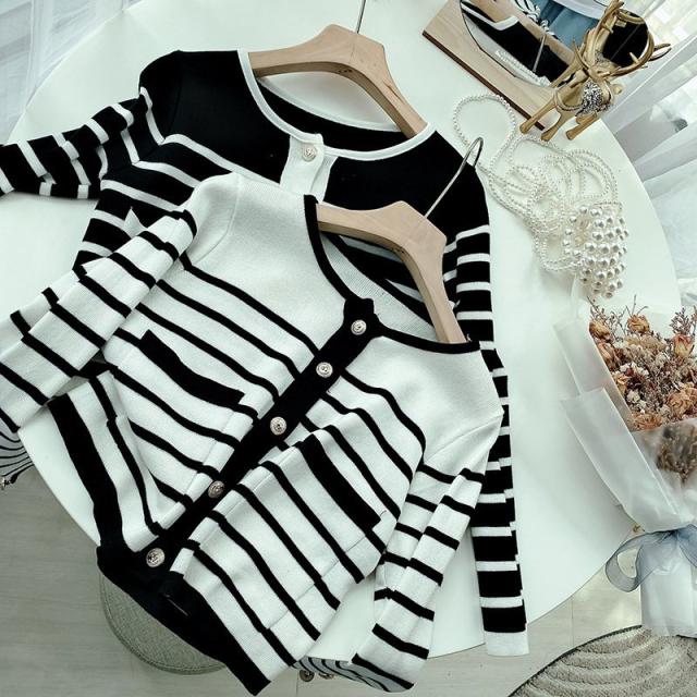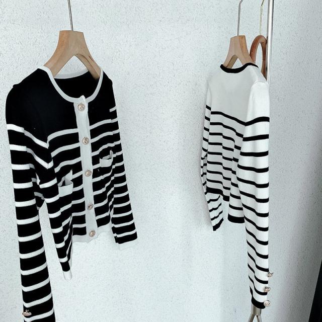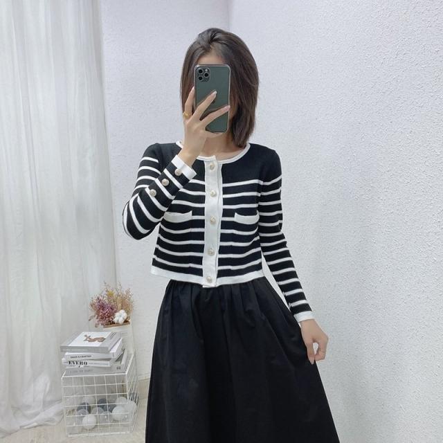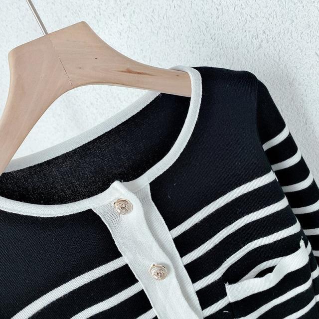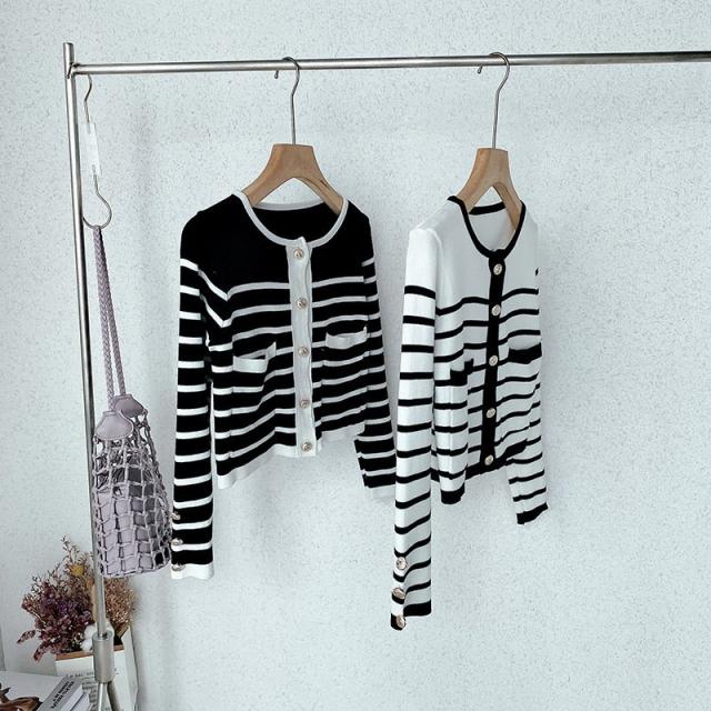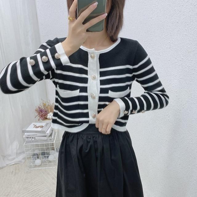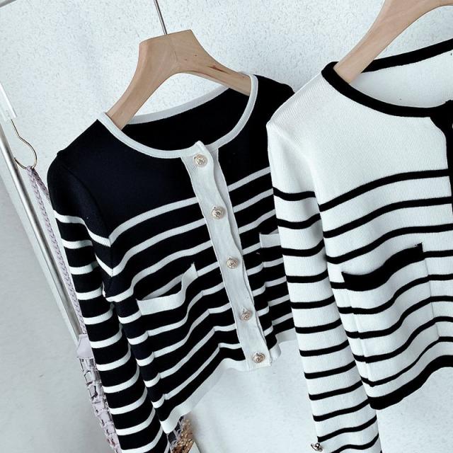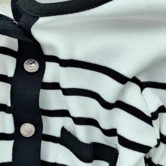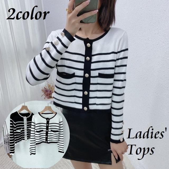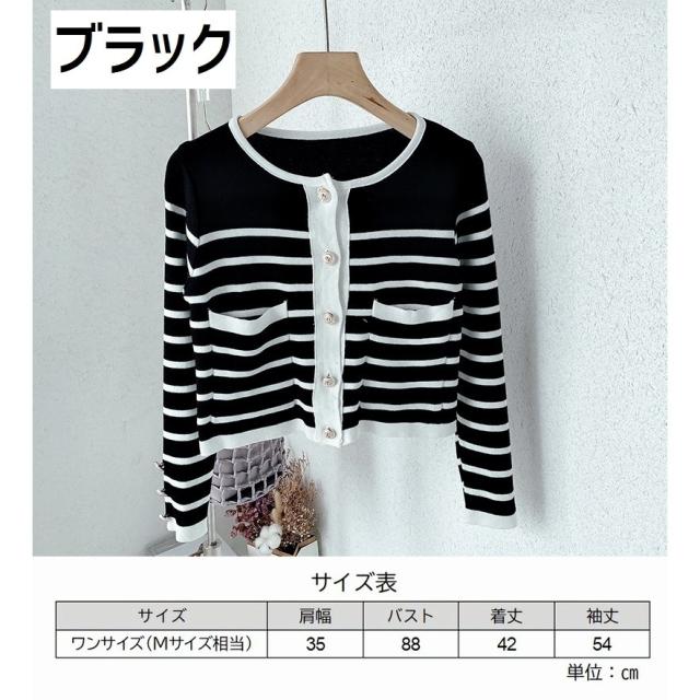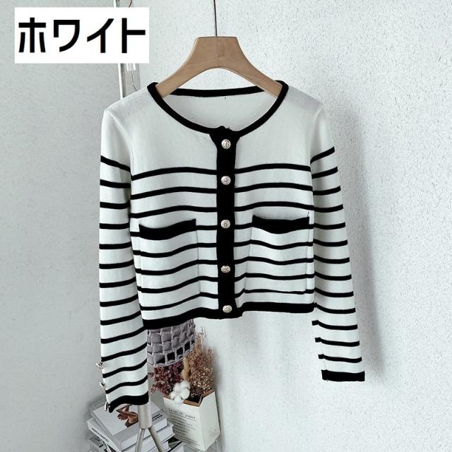 カーディガン 長袖 レディース トップス ニット 女性 前開き 前ボタン ラウンドネック ポケット ボーダー おしゃれ 可愛い 上品