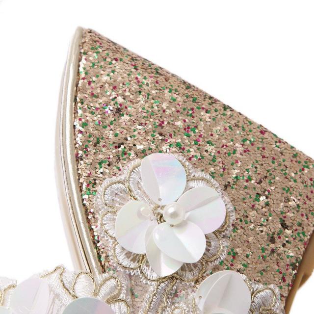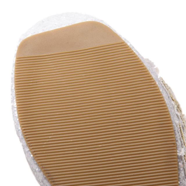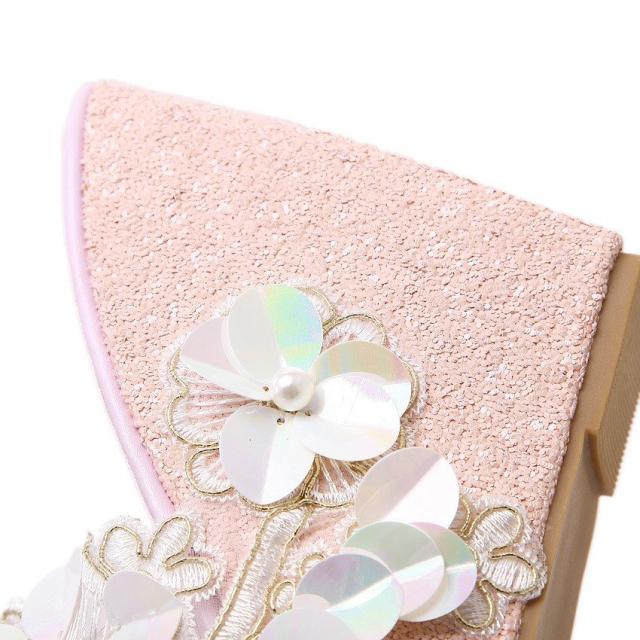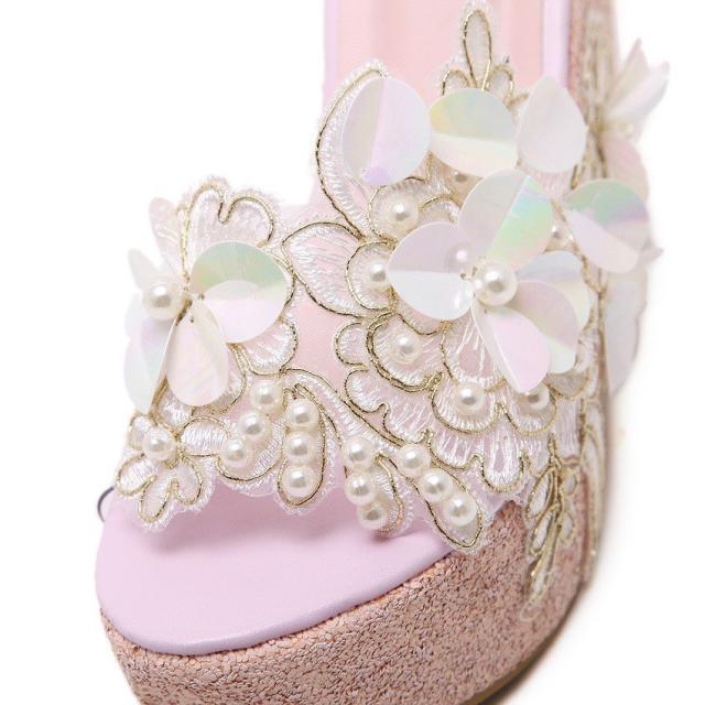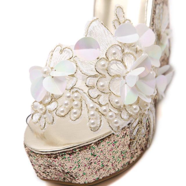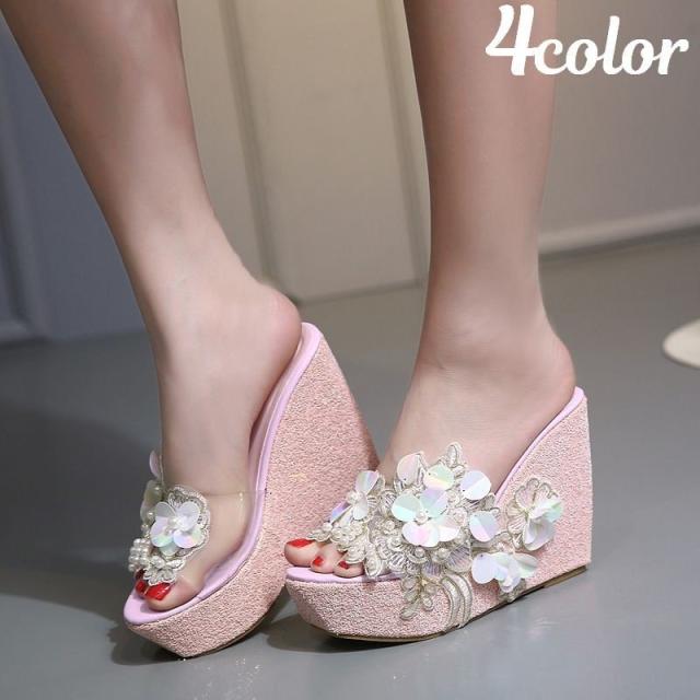ミュール サンダル 厚底 ウェッジソール オープントゥ ラメ フェイクパール レディース 靴 フラワーモチーフ 花 キラキラ おしゃれ 可愛い かわい