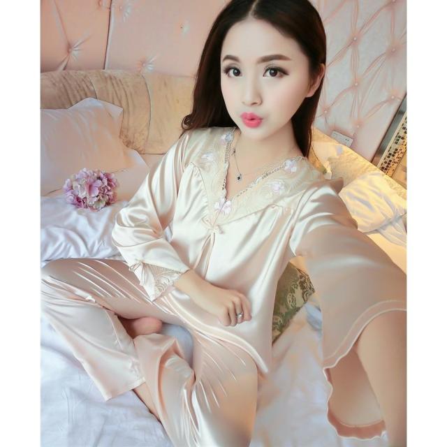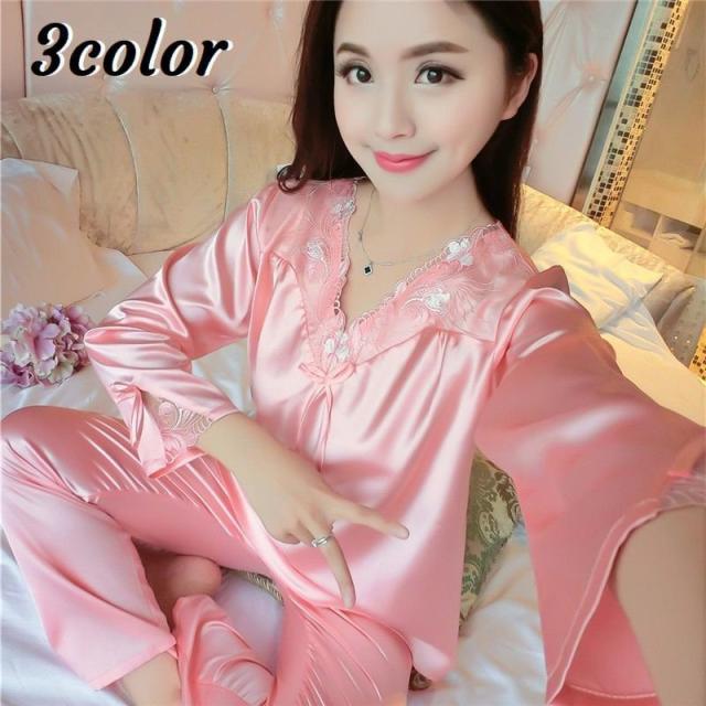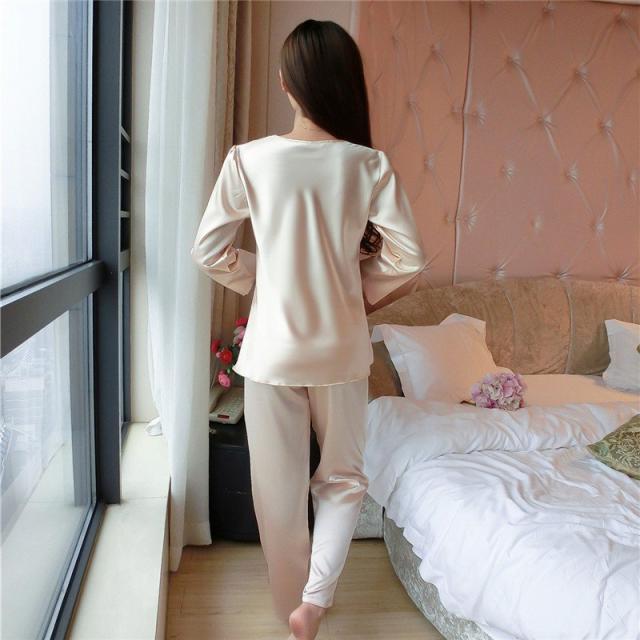 パジャマ 上下セット ルームウェア サテン調 レディース 婦人用 部屋着 ナイトウェア 長袖 プルオーバー Vネック ロングパンツ 長ズボン レース
