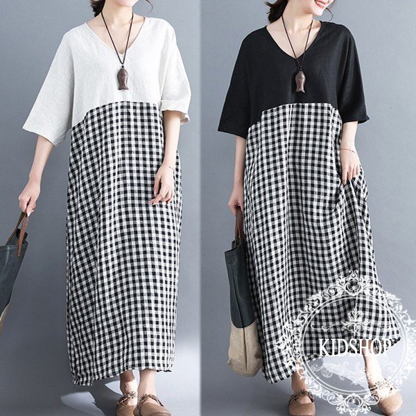 ワンピース レディース 40代 ロングワンピース リネンワンピース ミモレ丈 チェック柄 大きいサイズ 夏 韓国風