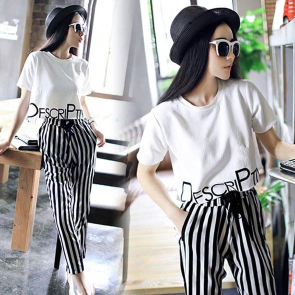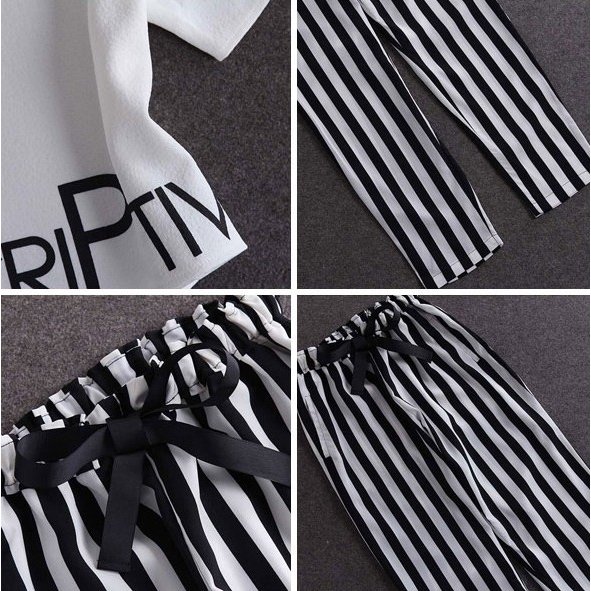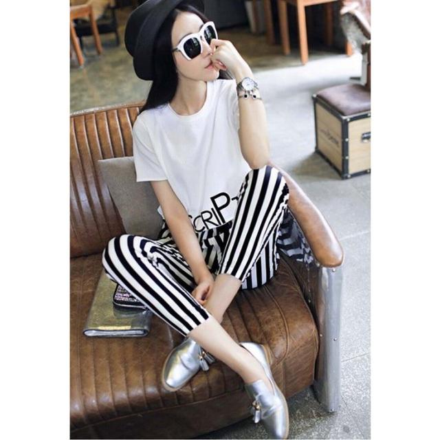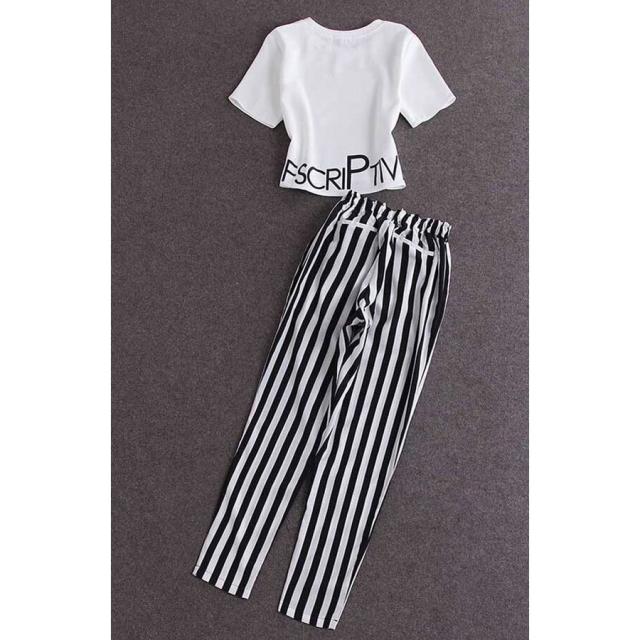 9分丈サルエルパンツ クロップドパンツ 半袖Tシャツ 半袖カットソー セットアップ レディース ストライプ柄 ロゴプリント ロゴTシャツ 白 黒 モノ