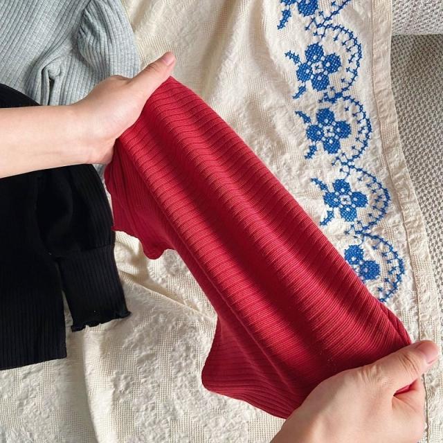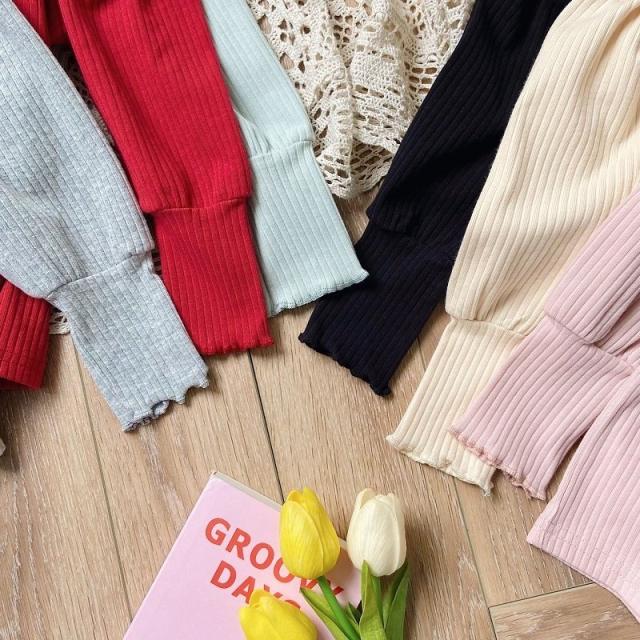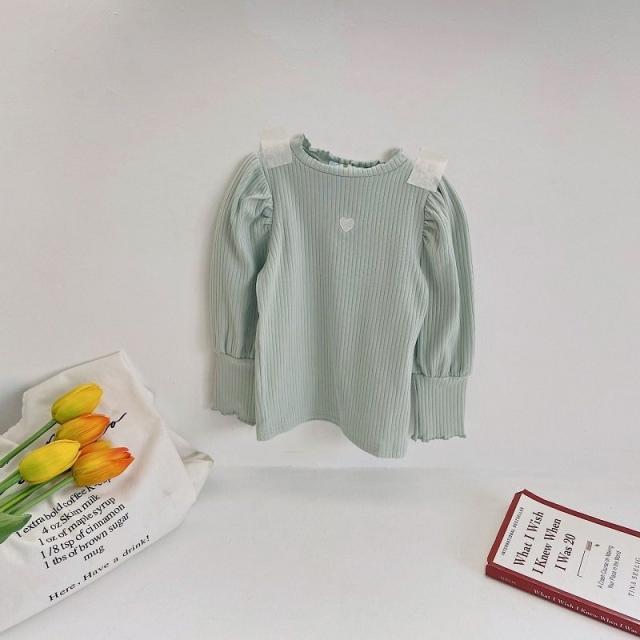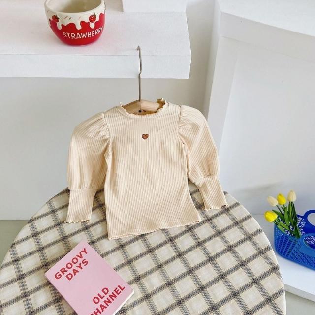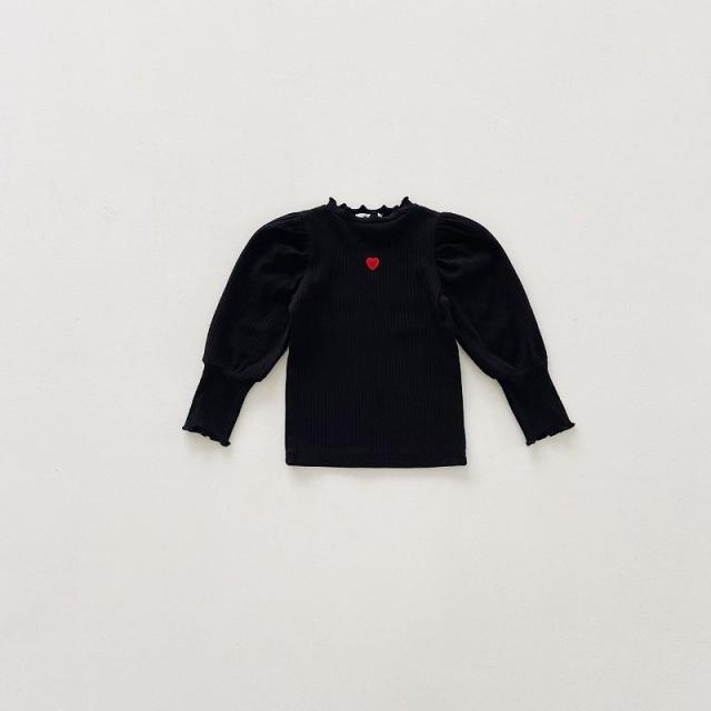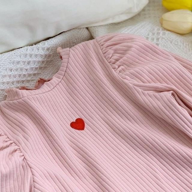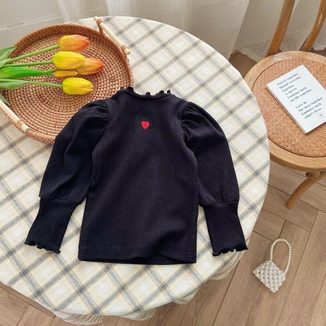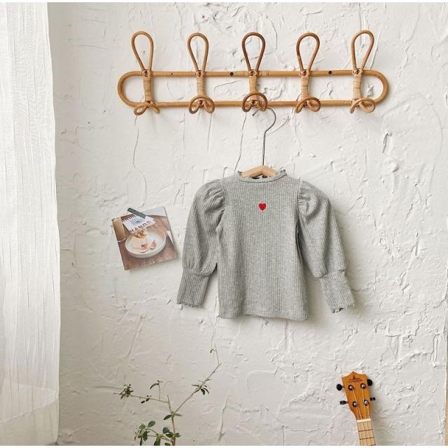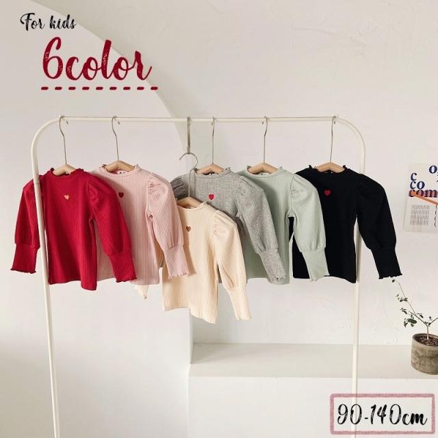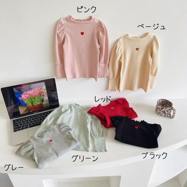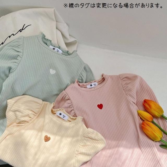 カットソー 長袖 キッズ 子供 女の子 トップス リブ フリルネック 袖フリル ギャザー ハート 刺繍入り 単色 無地 プルオーバー シンプル おしゃ