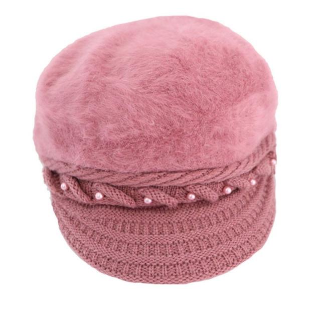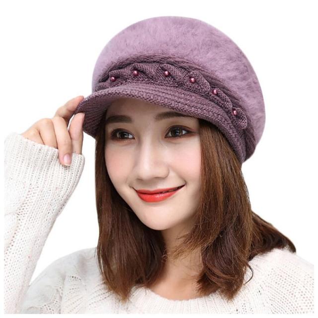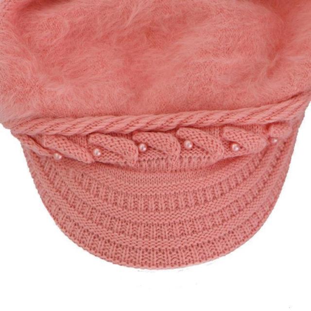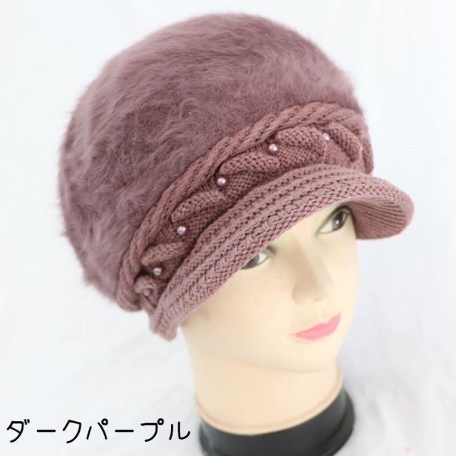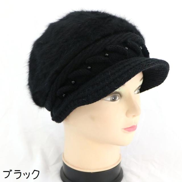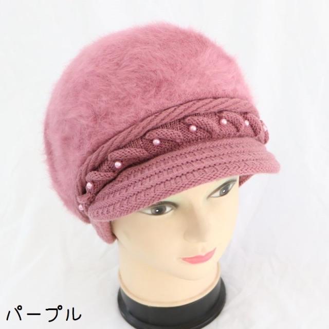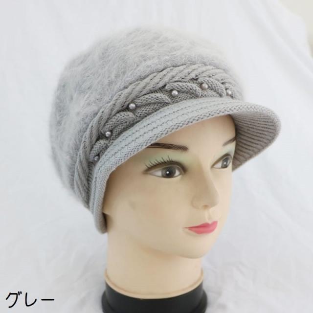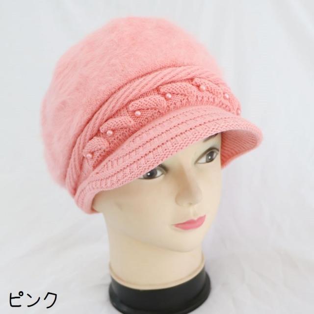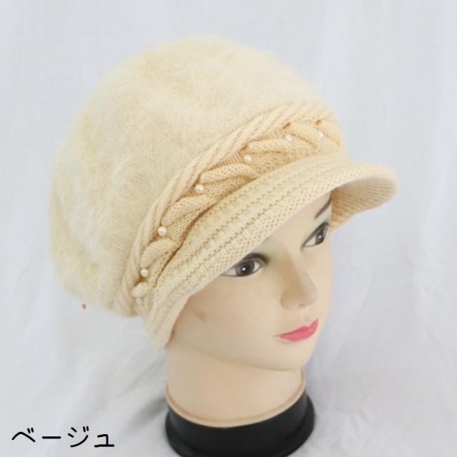 キャスケット帽 つば付き レディース 女性 婦人 ファッション小物 帽子 ニット 裏起毛 フェイクファー ケーブル編み フェイクパール 単色 あったか