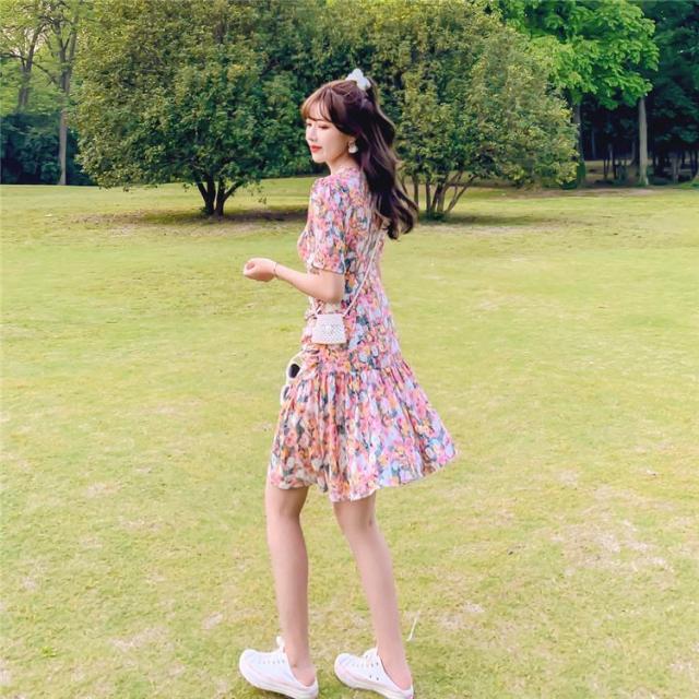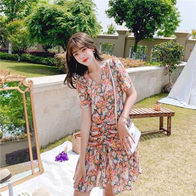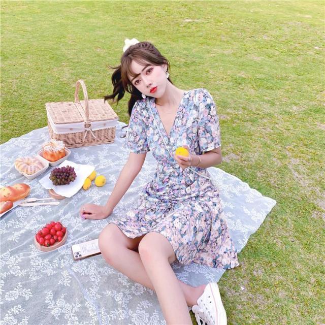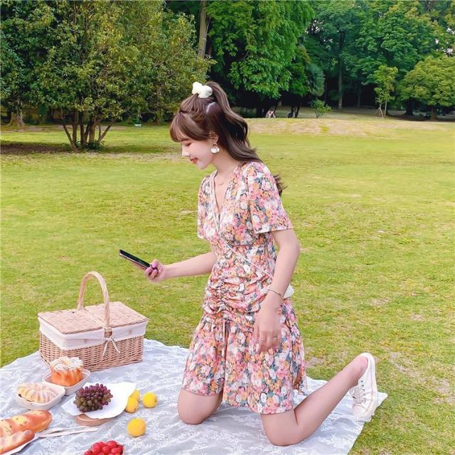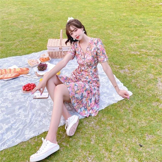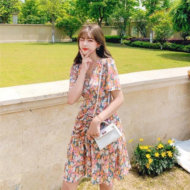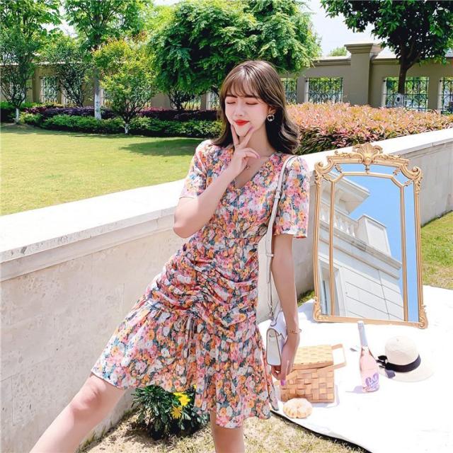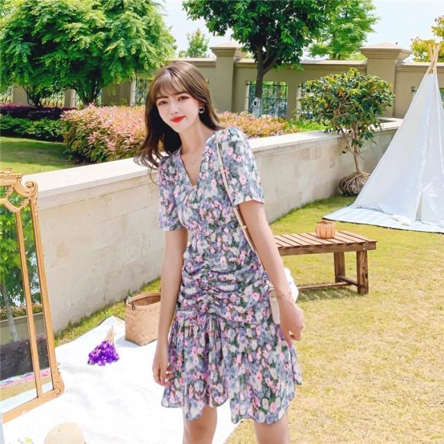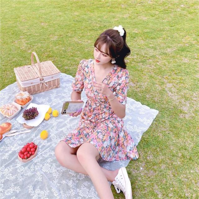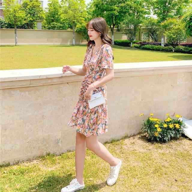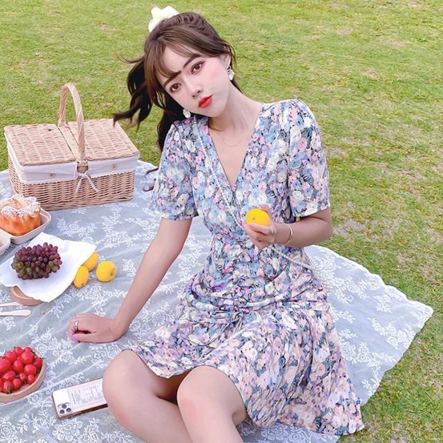 ワンピース レディース 40代 きれいめ 膝丈ンピース 春夏新作 半袖ワンピース 花柄Vネック Aラインスカートオシャレ韓国風 大人 結婚式ドレス 上品 30代