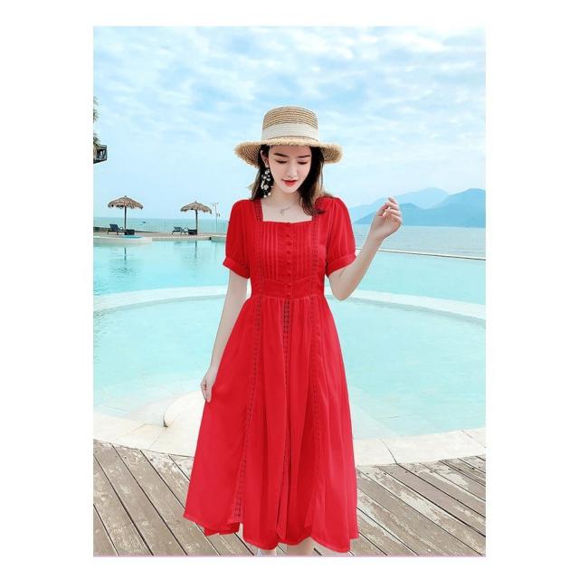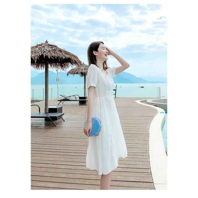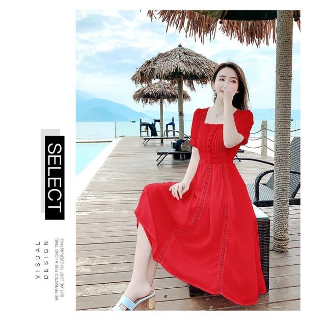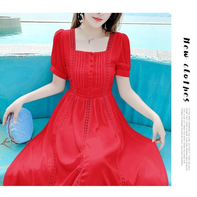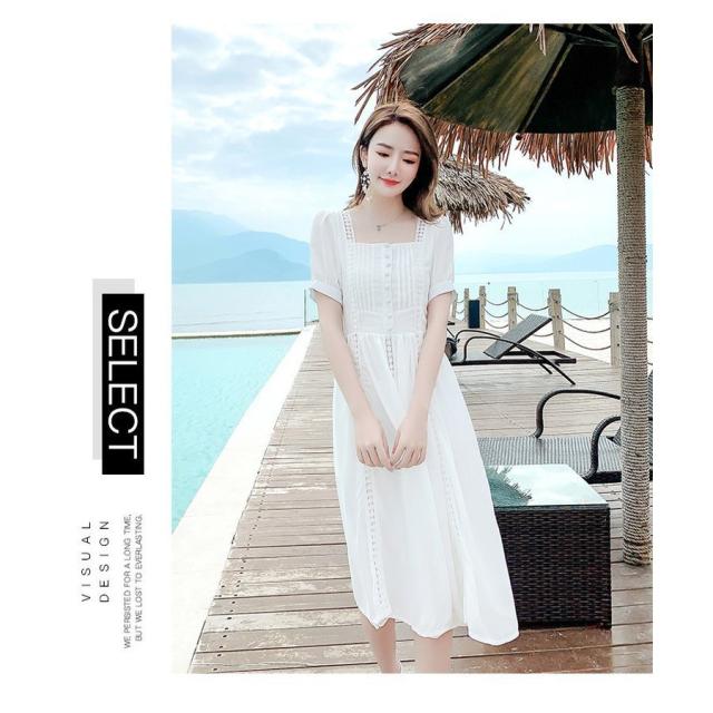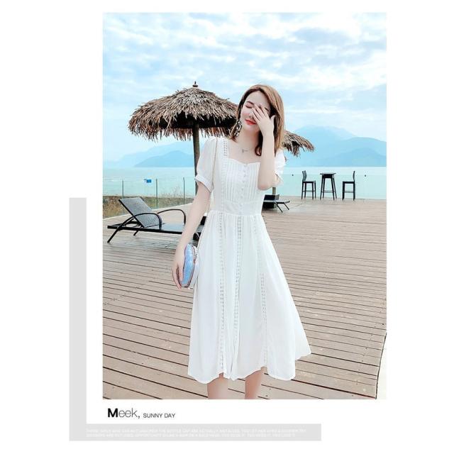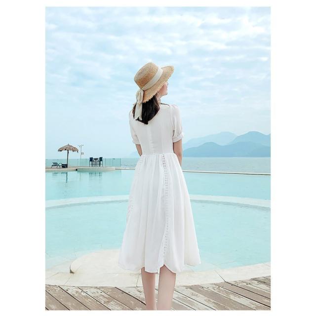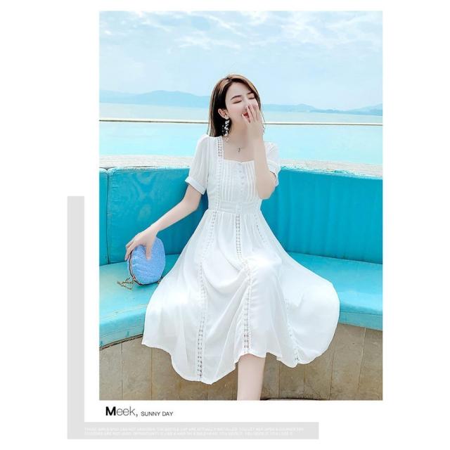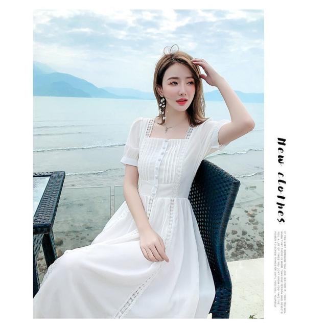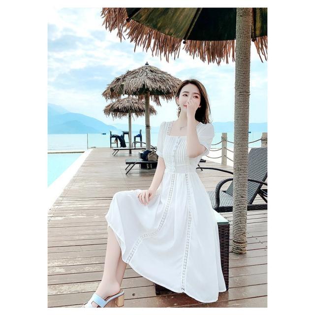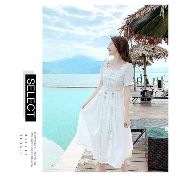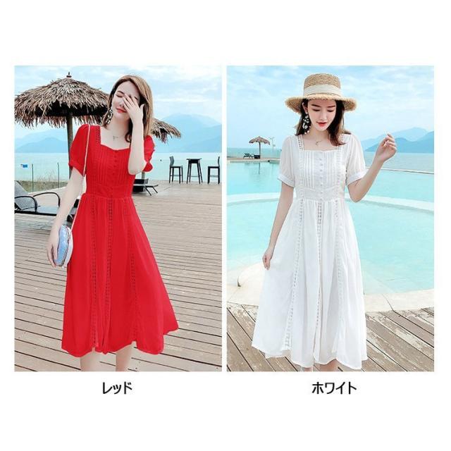ワンピース レディース 40代 マキシワンピース 春夏新作 半袖ワンピース 白レース スクエアネック フレアスカート オシャレ韓国風 大人 結婚式ドレス旅行