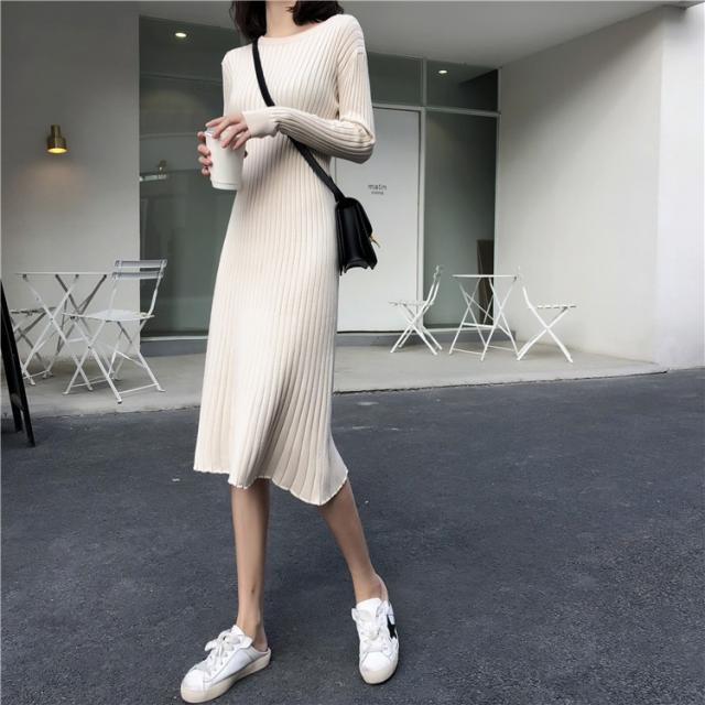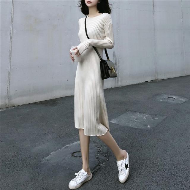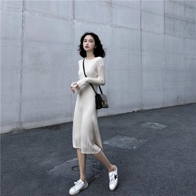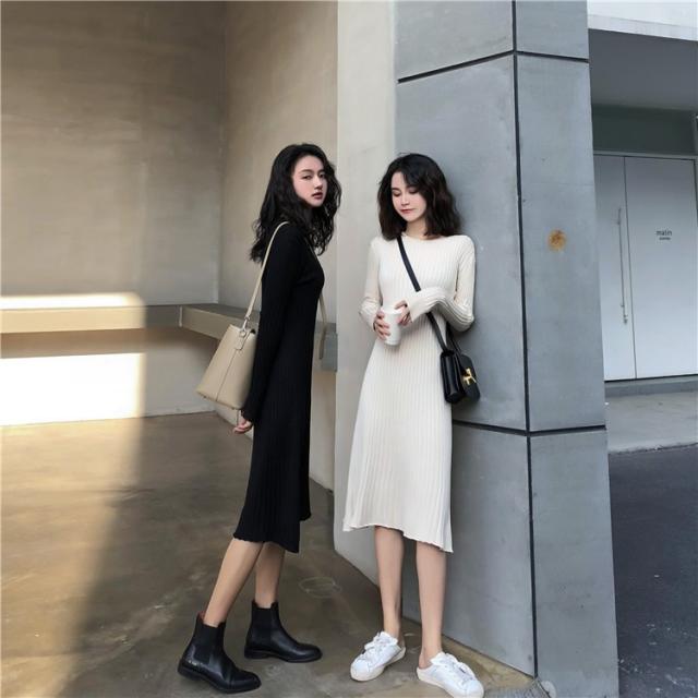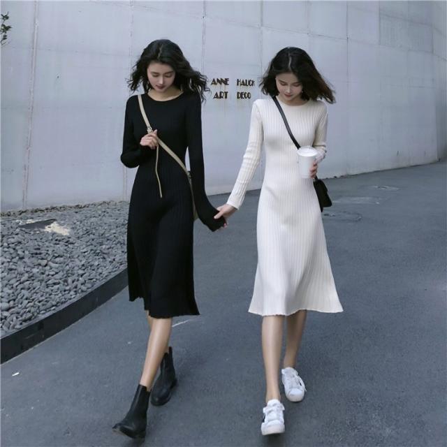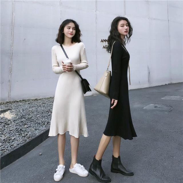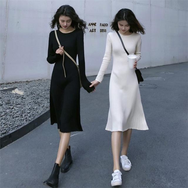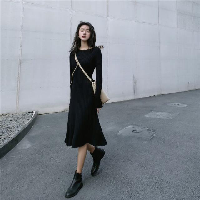 ニット ワンピース レディース オシャレ ニットワンピース 長袖 ニット 膝丈 着痩せ コーデ オシャレ Aライン 黒ワンピ 2019 春秋 20代 30代 40代