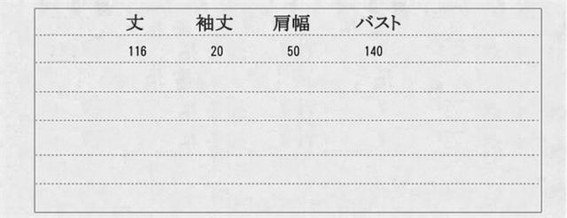 | サイズについての説明 | 【サイズ】:約(cm) 丈:116 バスト:140 肩幅:50 袖丈:20 |