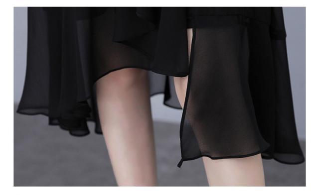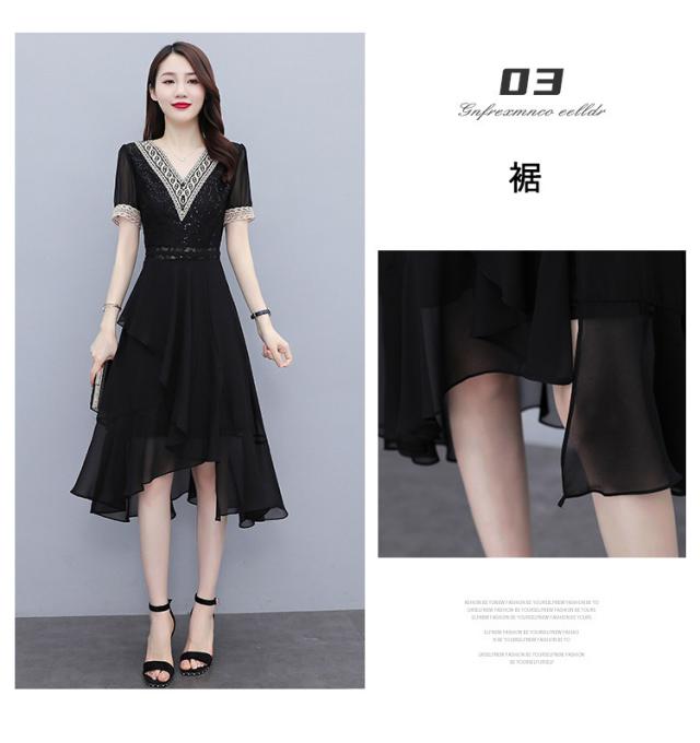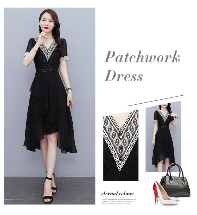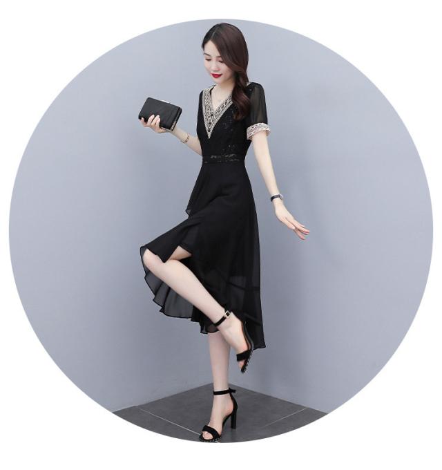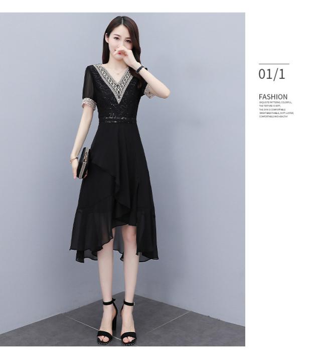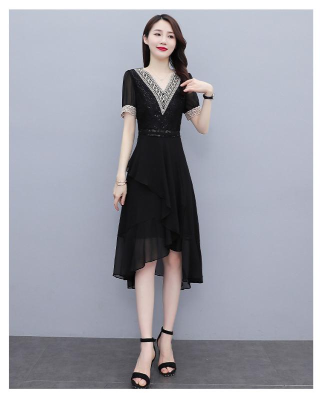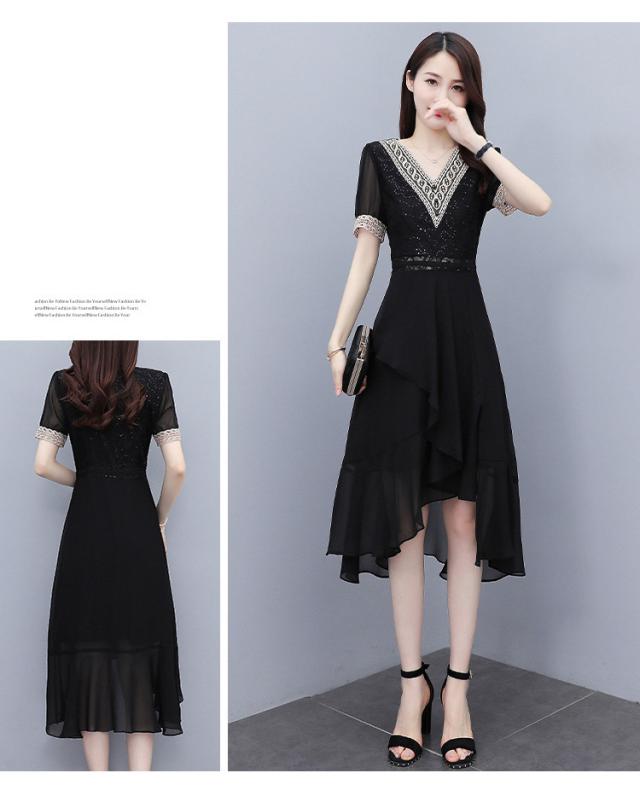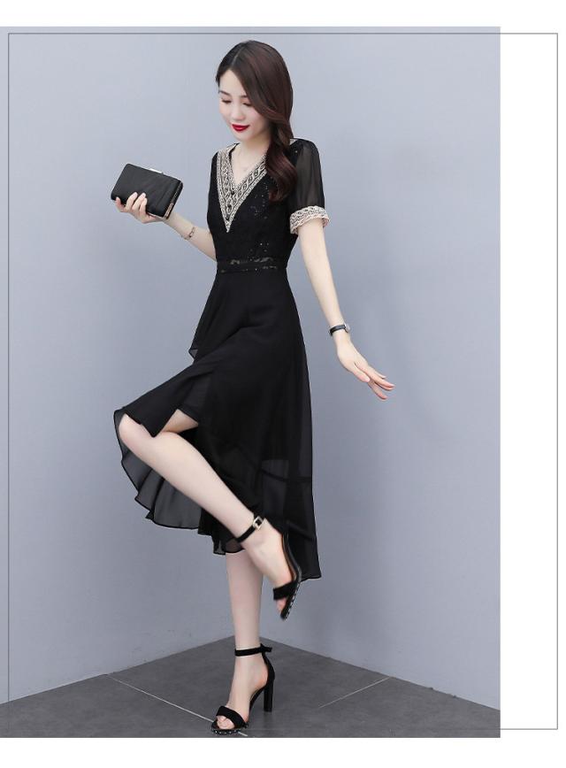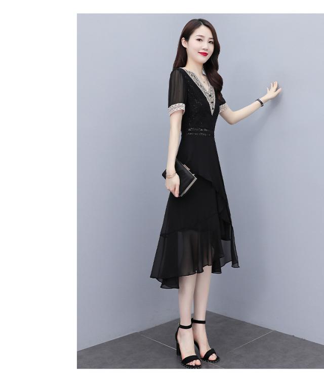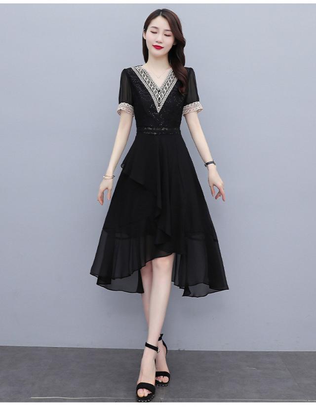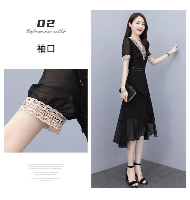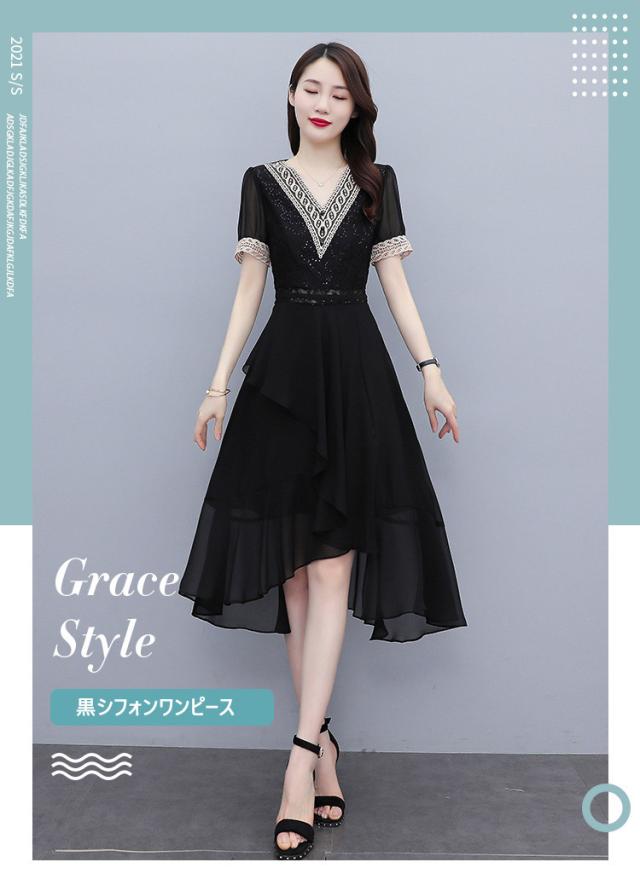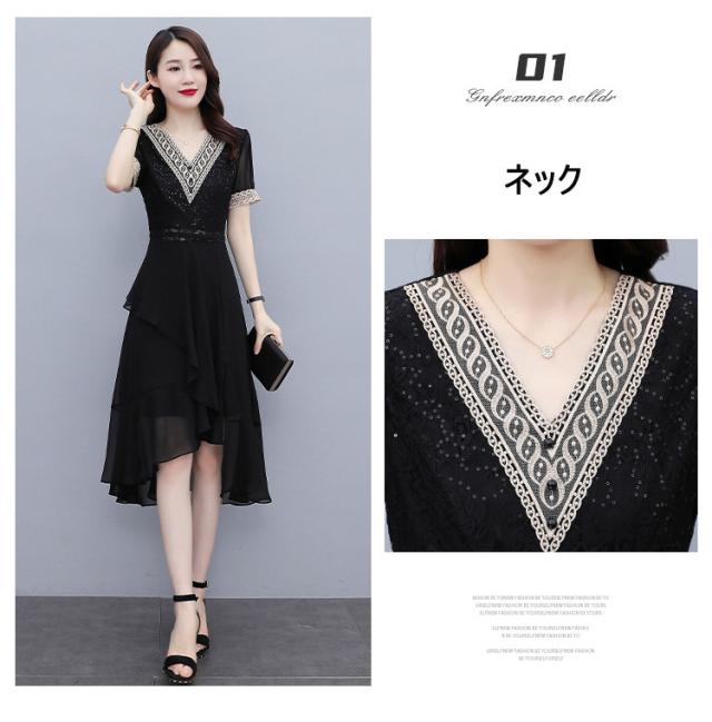 ワンピース レディース 40代 きれいめ 膝丈ワンピース 春夏 半袖ワンピース レースVネック 黒シフォン マーメイドスカート オシャレ 大人上品 お出かけ