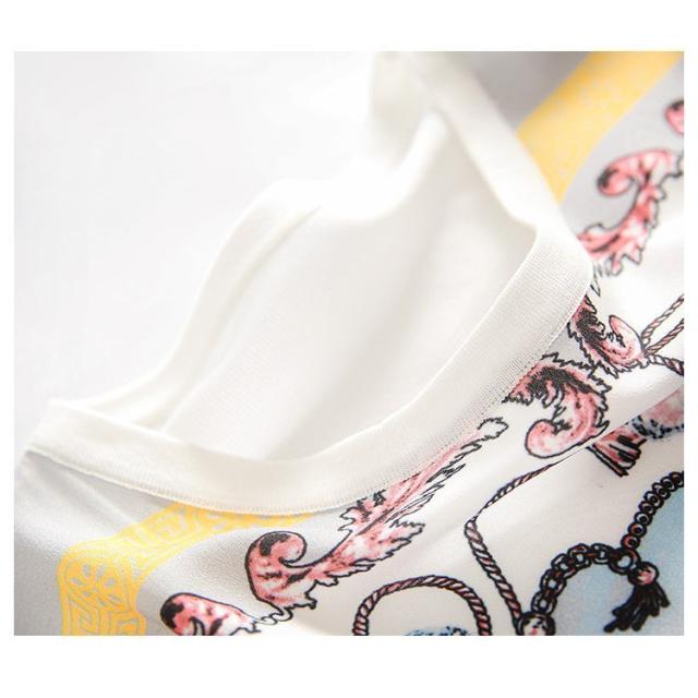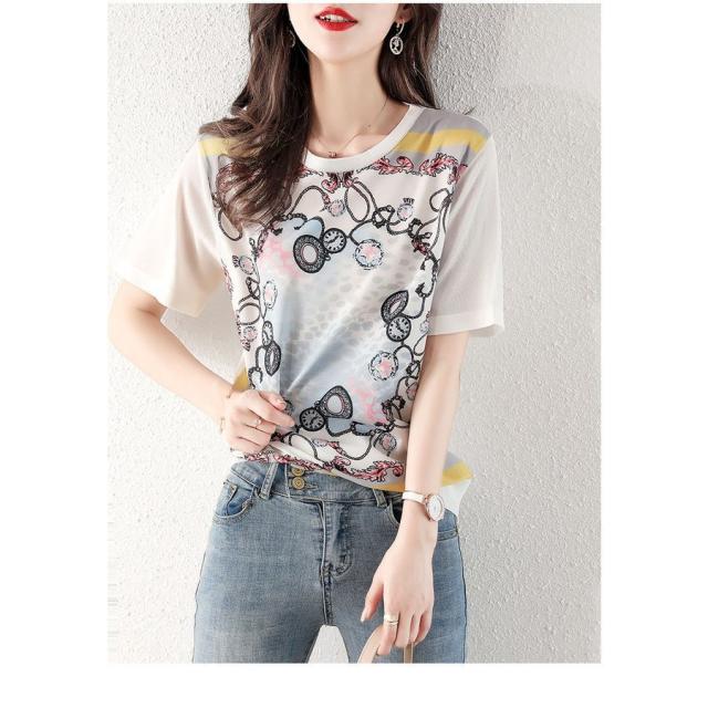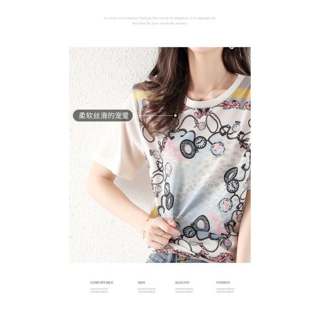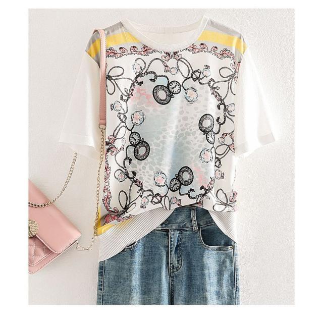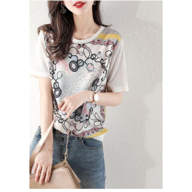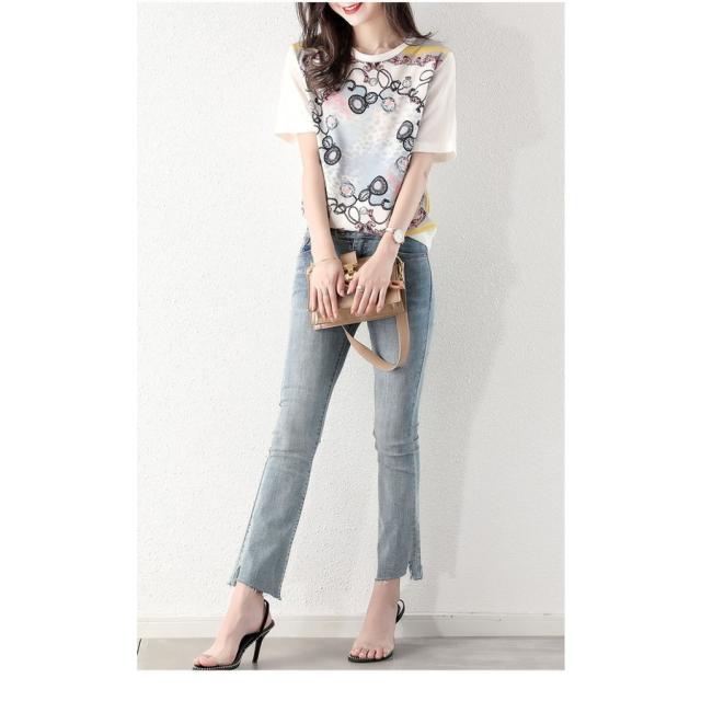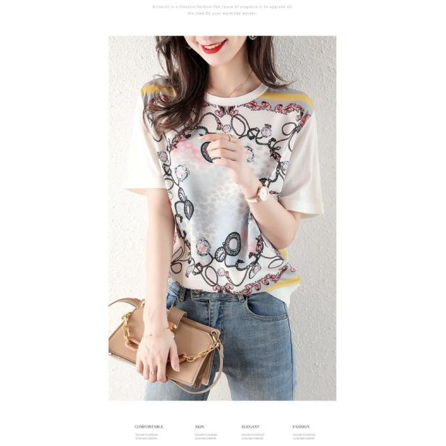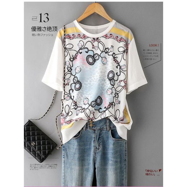 Tシャツ レディース 40代 春夏新作 オシャレブラウス シフォン切り替えニットソー 半袖トップス プリントTシャツ 大人 通勤 ゆったりカットソー 韓国風 30代