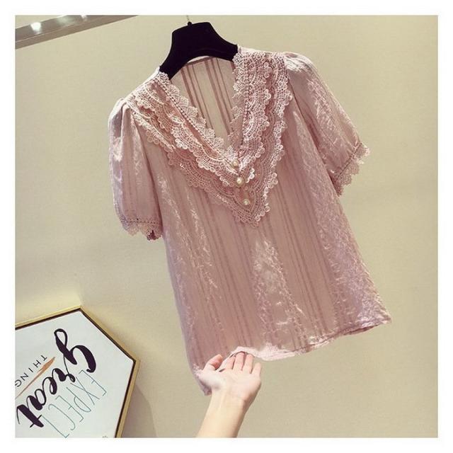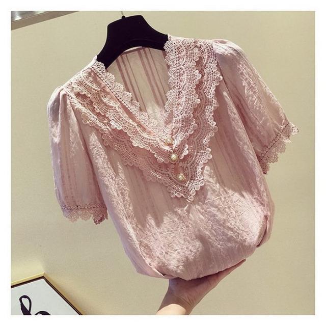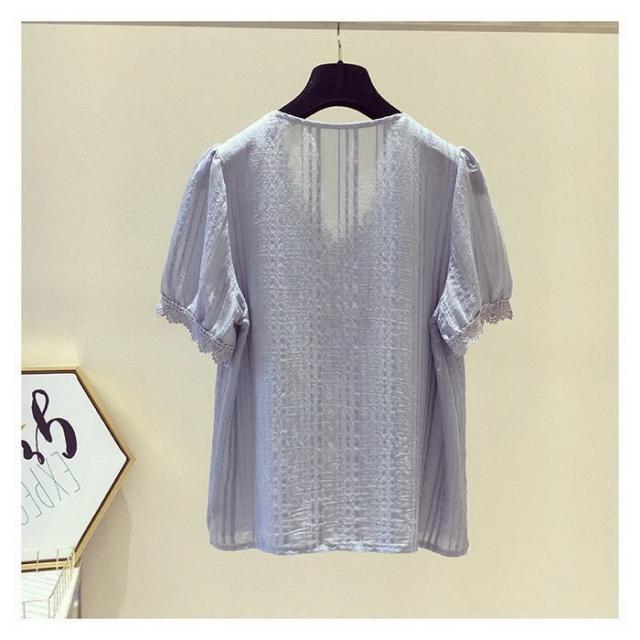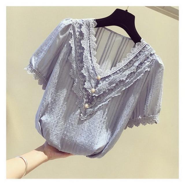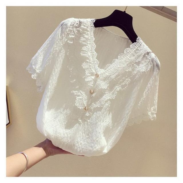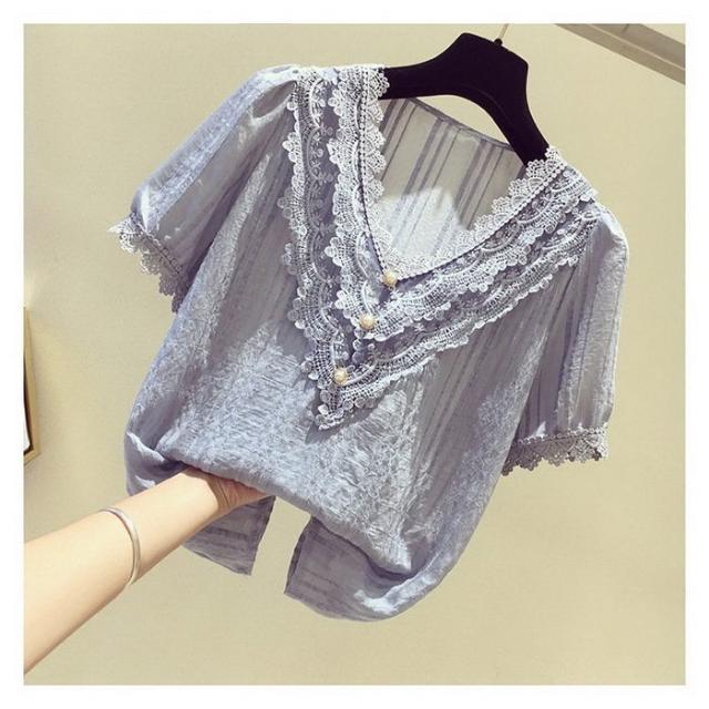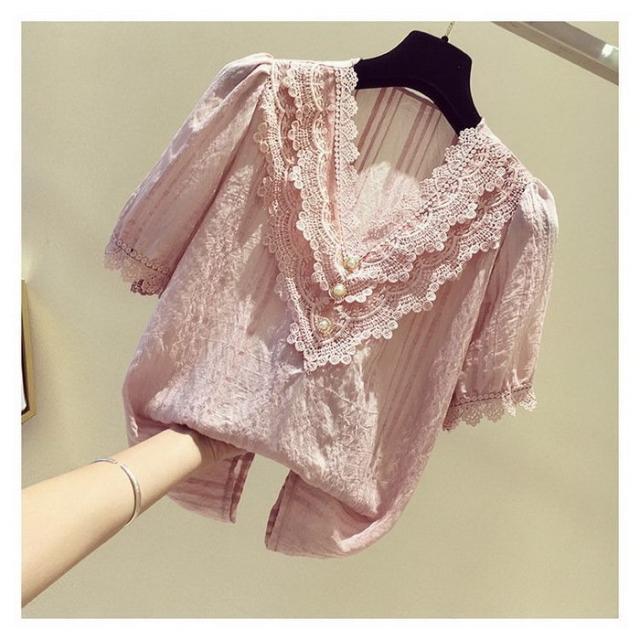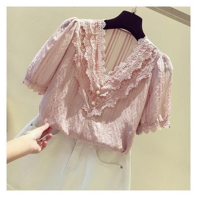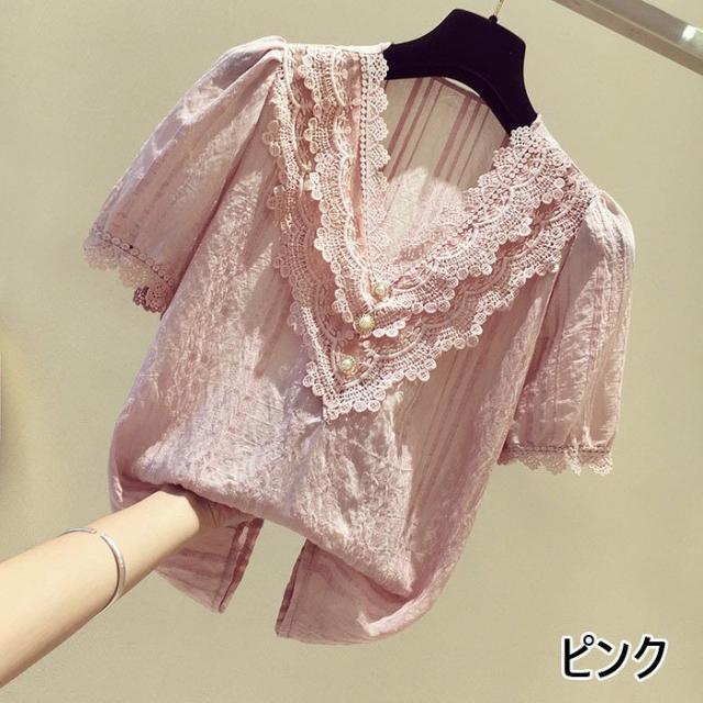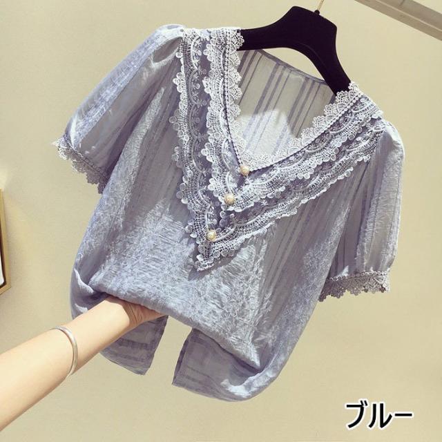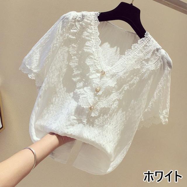 ブラウス レディース 40代 春夏 オシャレブラウス 白シフォンブラウス レースVネック パフスリーブブラウス 半袖トップス おしゃれ上品 大人 通勤OL ゆったり