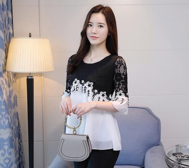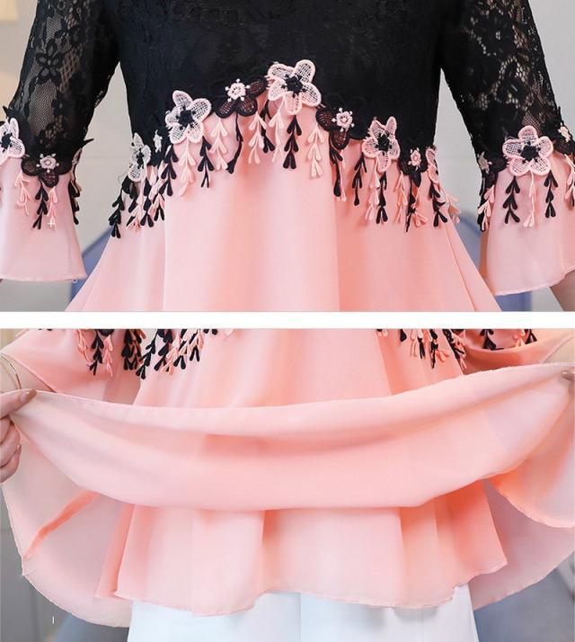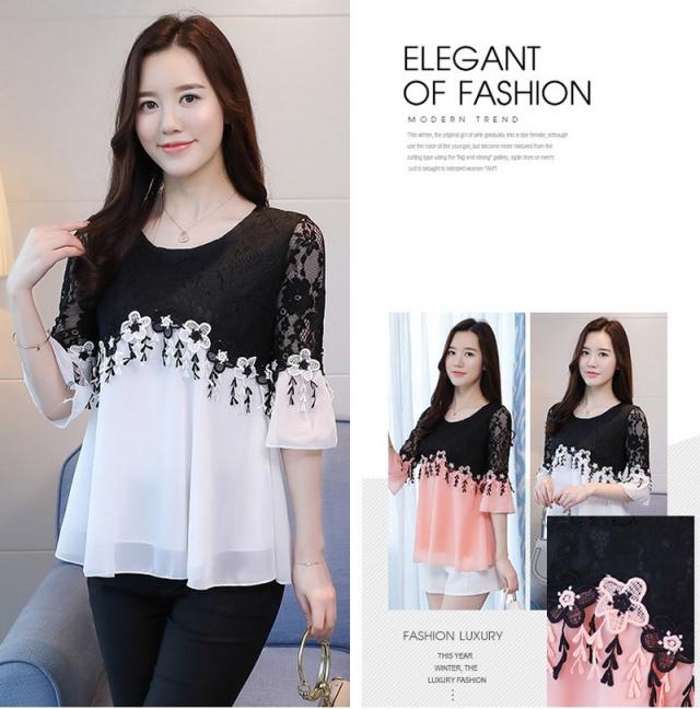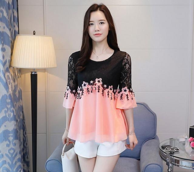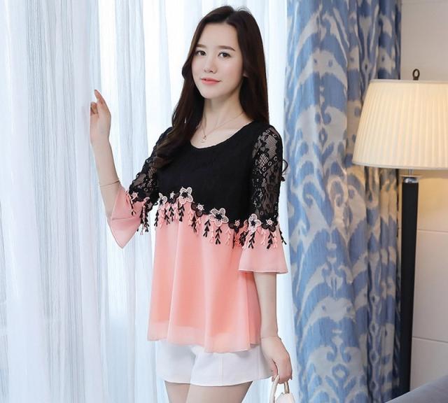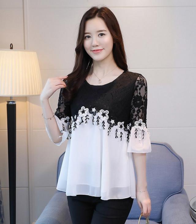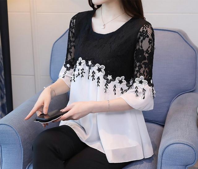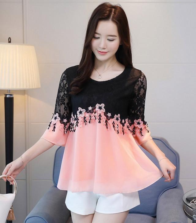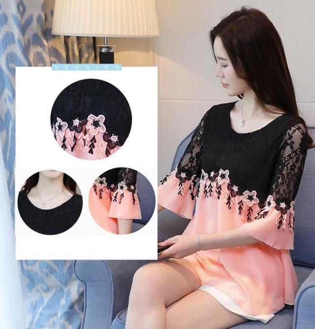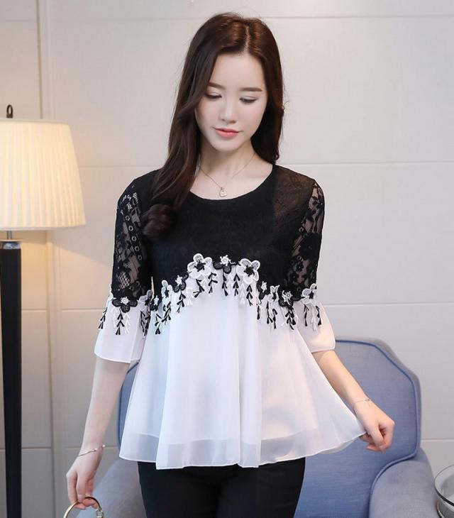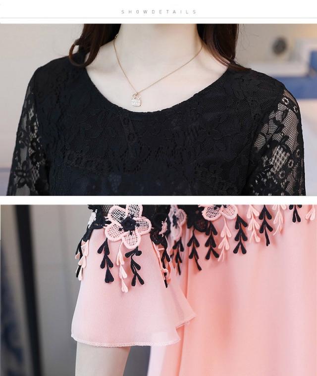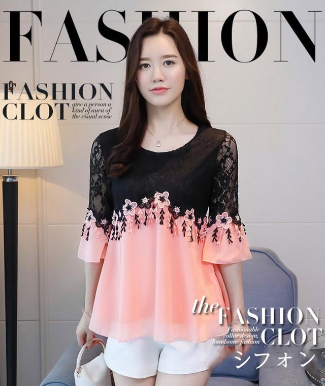 ブラウス トップス レディース シフォン Tシャツ カットソー ラウンドネック フリル レース 半袖 夏