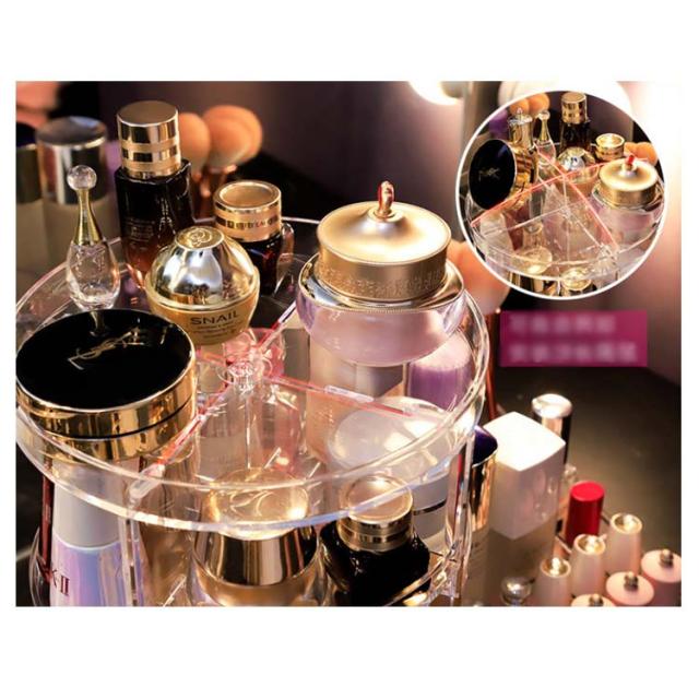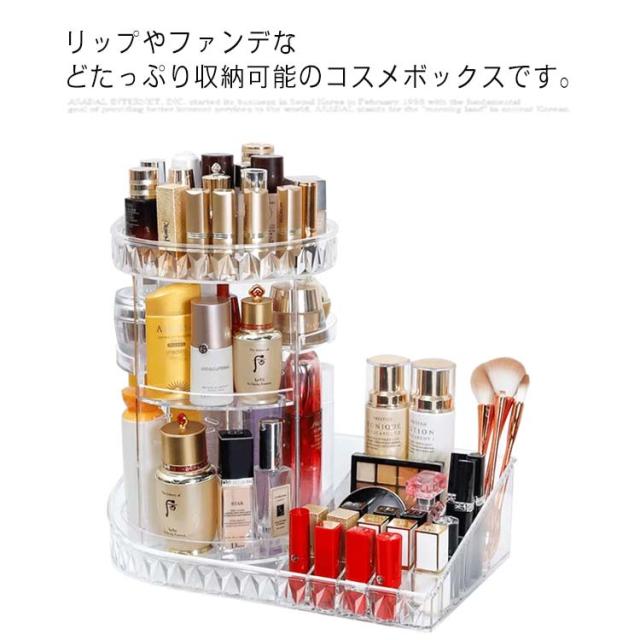 | リップやファンデなどたっぷり収納可能のコスメボックスです。 360°回転式で取り出しやすい。 回転体の仕切り板は高さ調整可能。 水洗い可能なアクリル製。 おしゃれなダイヤモンドカットデザイン! | |