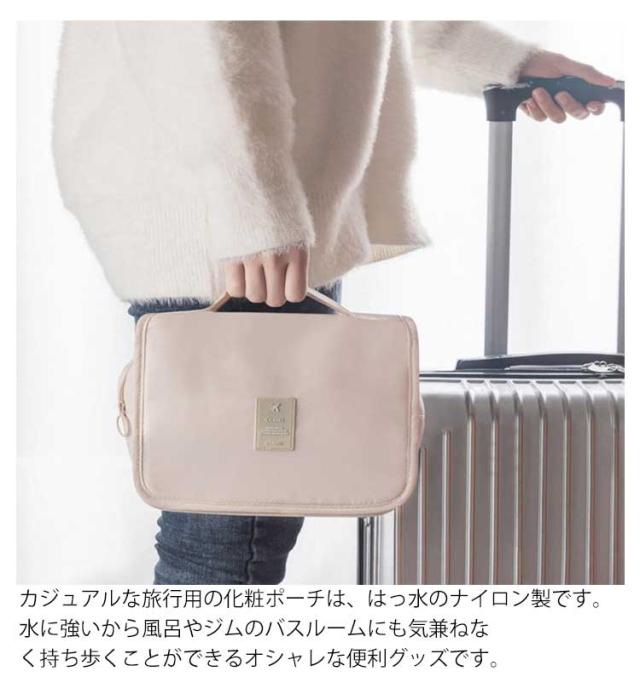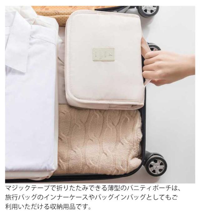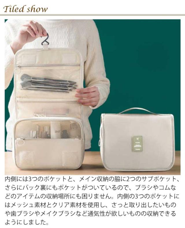 | 化粧ポーチやトラベルポーチ、おむつポーチ、クローゼット収納などマルチに使えるマルチポーチです。6つのポケットがついて、大容量たっぷり収納ができ、使い方はあなた次第で無限に広がります。 内側には3つのポケットと、メイン収納の脇に2つのサブポケット、さらにバック裏にもポケットがついているので、ブラシやコムなどのアイテムの収納場所にも困りません。内側の3つのポケットにはメッシュ素材とクリア素材を使用し、さっと取り出したいものや歯ブラシやメイクブラシなど通気性が欲しいものの収納できるようにしました。 持ち歩きの際に便利な持ち手、さらに収納可能なフックを付けて洗面所やクローゼット内での収納や利用が便利になっています。 カジュアルな旅行用の化粧ポーチは、はっ水のナイロン製です。水に強いから風呂やジムのバスルームにも気兼ねなく持ち歩くことができるオシャレな便利グッズです。 マジックテープで折りたたみできる薄型のバニティポーチは、旅行バッグのインナーケースやバッグインバッグとしてもご利用いただける収納用品です。 | |