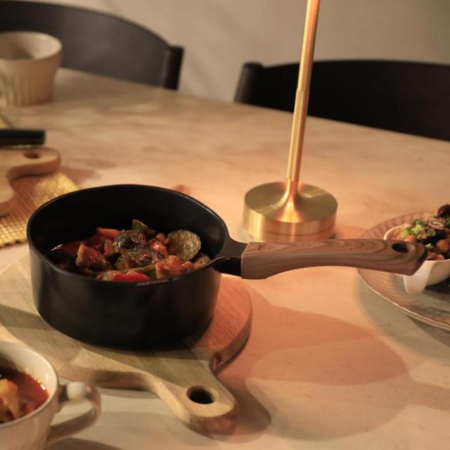 ブラック×木目調がオシャレなデザインなので、調理してそのまま食卓に並べられます。ハンドルは滑りにくく、握りやすくなっています。