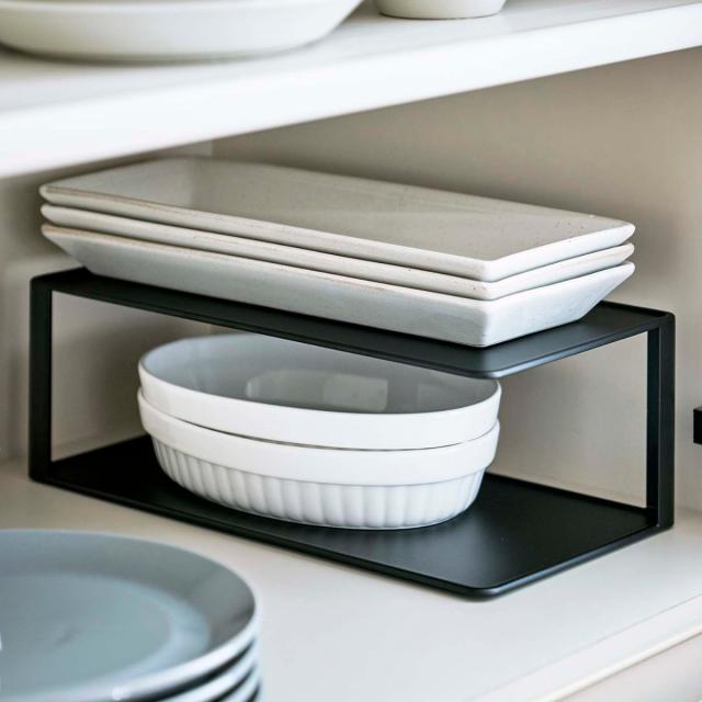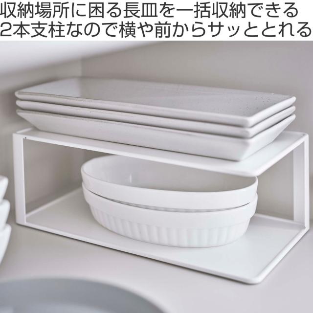 棚の中の食器類を出し入れしやすく収納できる「長皿収納ラック」です。置くだけで2段収納になるので、省スペースにたくさんの食器をきれいに収納できます。