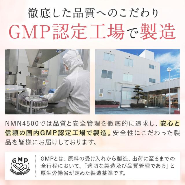 NMN4500では品質と安全管理を徹底的に追求し、安心と信頼の国内GMP認定工場で製造。安全性にこだわった製品を皆様にお届けしております。