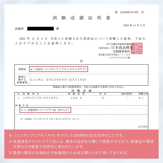 国内の検査機関で証明された純度100%のNMNだけを贅沢に配合しました。