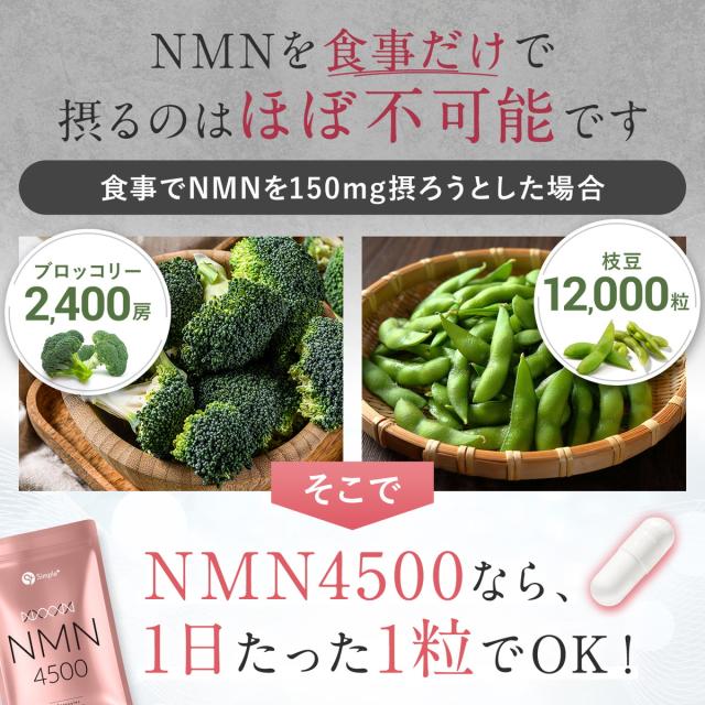 食事でNMNを150mg摂ろうとした場合、ブロッコリー2,400房、枝豆12,000粒ほど必要で現実的ではありませんが、NMN4500なら1日たった1粒でOKです。