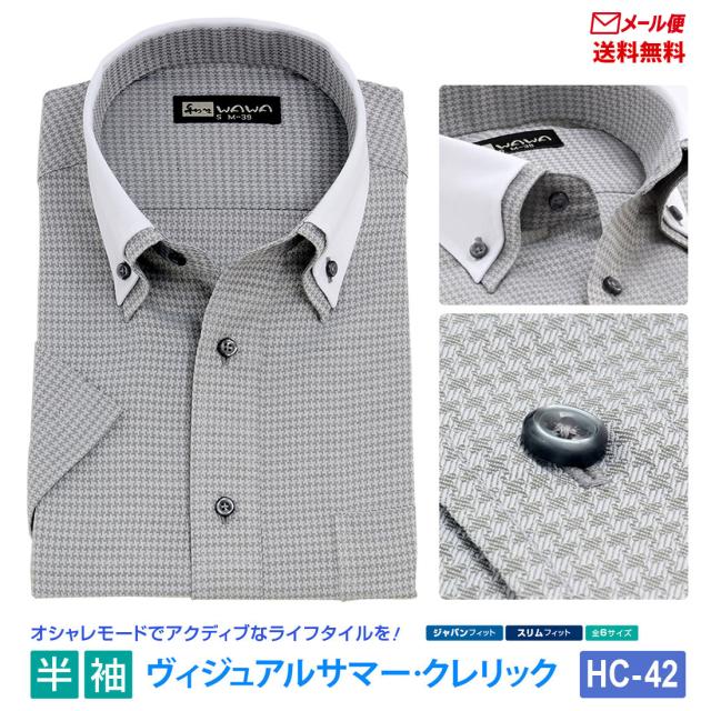 【メール便】 半袖 クレリック メンズ ワイシャツ ボタンダウン 二重襟 グレー地紋柄 形態安定 Yシャツ ビジネス 6サイズ スリム 標準体 M L LL 3L から選べる HC-42 送料無料