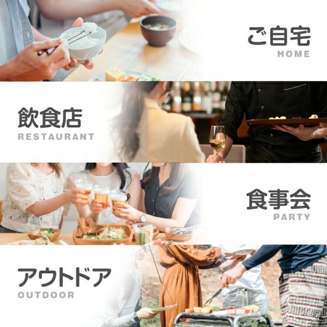 ご自宅ではもちろん、お盆、正月、GWの帰省時等親戚一同が集う会食やパーティー、バーやカフェ、居酒屋等の飲食店、またBBQやキャンプ等のアウトドアシーンでも活躍します。