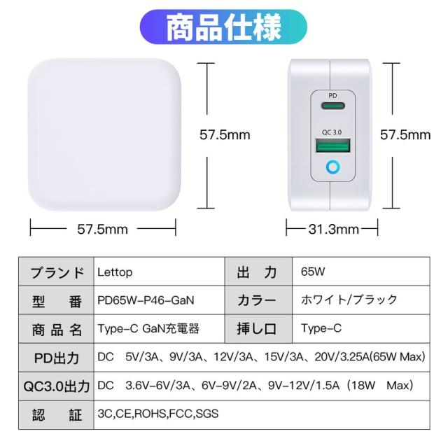 ■USB-Cポート出力PD3.0対応 5V/3A,9V/3A,12V/3A,15V/3A,20V/3.25A 最大65W USB-Aポート出力:QC対応 5V/3A,9V/2A,12V/1.5A 最大18W