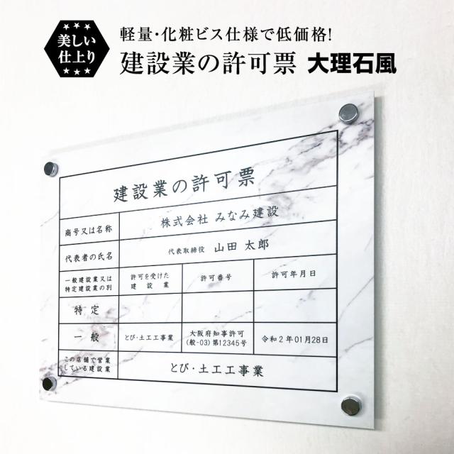 業者票 建設業の許可票 アルミ複合板 大理石風 化粧ビス付き H35×W45cm 許可票 建設業許可票 不動産 法定看板 事務所 店舗 ken-marble-bisu