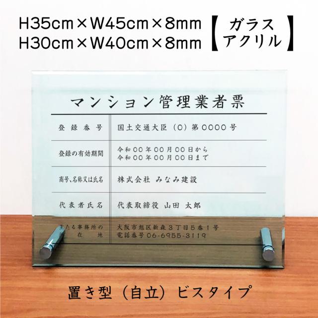 令和6年最新 マンション管理業者票 【令和6年6月30日施行版】 ガラスアクリル 自立型 H30×W40cm,H35×W45cm man-glass-acryl01-jiritu