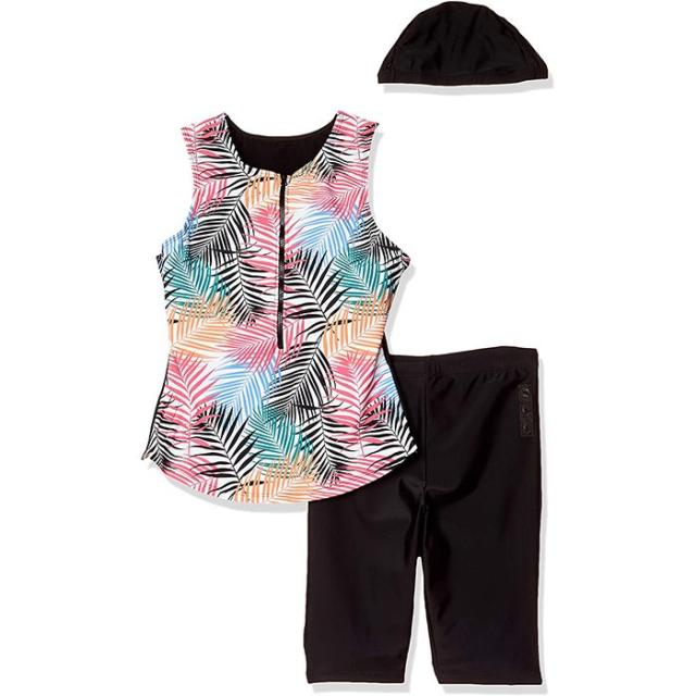■商品名:フィットネス水着 キャミソールタイプ M〜Lサイズ 帽子付 コンパクトさらし 胸スッキリ 細魅せライン 水着 スイムウェア ヤシの葉柄