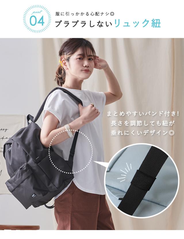 長さ調節可能なショルダーはリュック紐が垂れ下がらず、