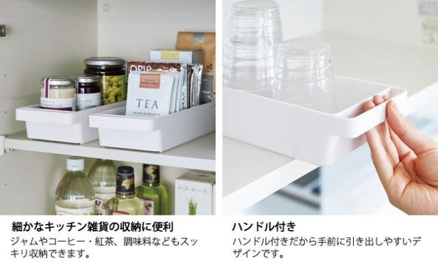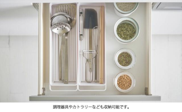 瓶類や小さなキッチン雑貨、カトラリー類などの収納にも便利。