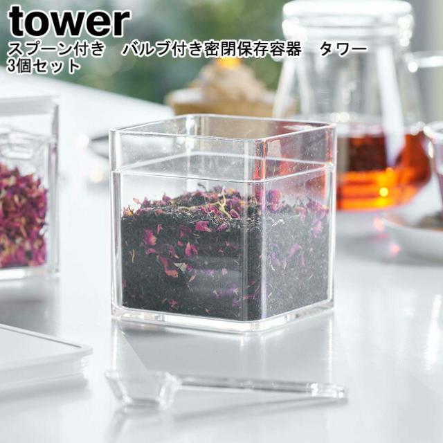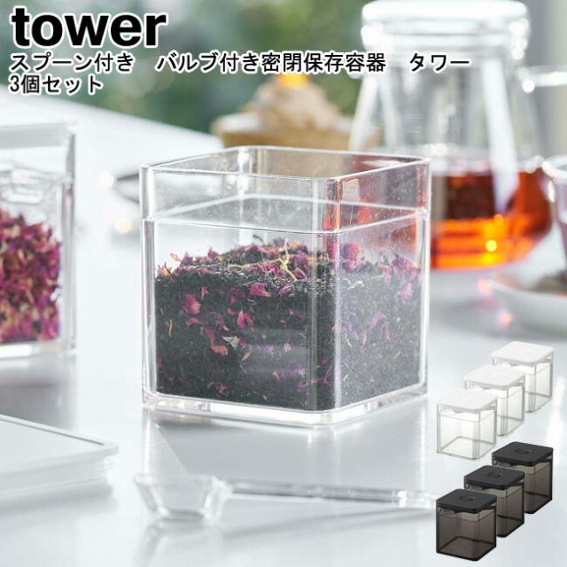 MM1 3個セット 《 スプーン付き バルブ付き密閉保存容器 タワー》tower山崎実業 ホワイト ブラック 5465 5466 保存容器 密閉 食品保存 スクエア パッキン付き キャニスター ストッカー コンテナ スタッキング 収納 紅茶 コーヒー シンプル モノトーン YAMAZAKI ヤマジツ