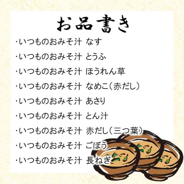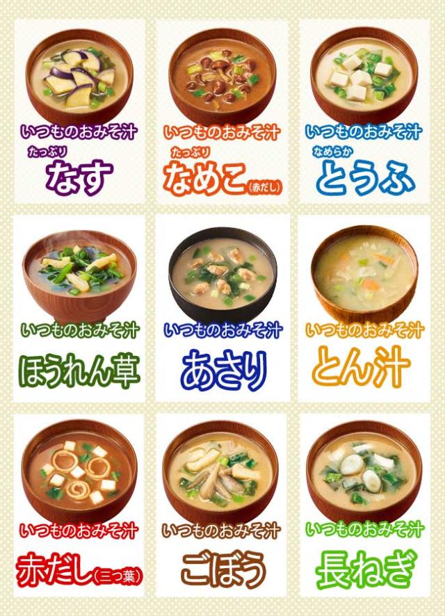 いつものおみそ汁 なす ×1 いつものおみそ汁 とうふ ×1 いつものおみそ汁 ほうれん草 ×1 いつものおみそ汁 なめこ(赤だし) ×1 いつものおみそ汁 あさり ×1 いつものおみそ汁 とん汁 ×1 いつものおみそ汁 赤だし(三つ葉) ×1 いつものおみそ汁 ごぼう ×1 いつものおみそ汁 長ねぎ ×1 計9食 ※メーカー欠品等によりセット内容が変更になる場合があります。 |
